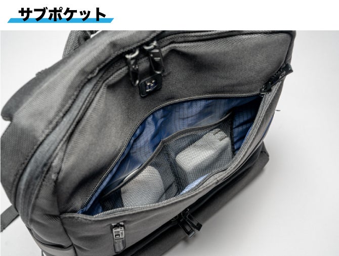 サブポケットにはメッシュ素材のポケットが設置されています。PC用の小物などを入れておくのに便利です。