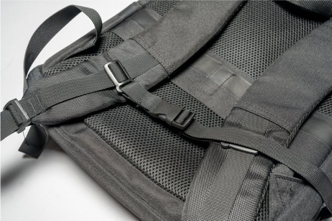 肩ひも部分には胸バンドを設置し、身体に固定させることでブレを軽減し身体への負荷を抑えます。
