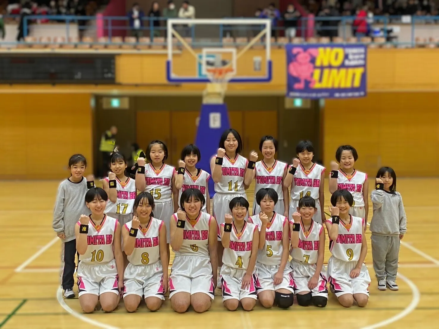 私たち『富田BRバスケットボールクラブ』は、福島県郡山市で『No Limit』を掲げ、日々成長するチームとして練習に全力で取り組み、『全国制覇』の夢に向かって頑張ってきました。現在6年生8人、5年生1人、4年生5人、3年生2人、2年生1人、コーチ陣2人、計19人で活動しています。