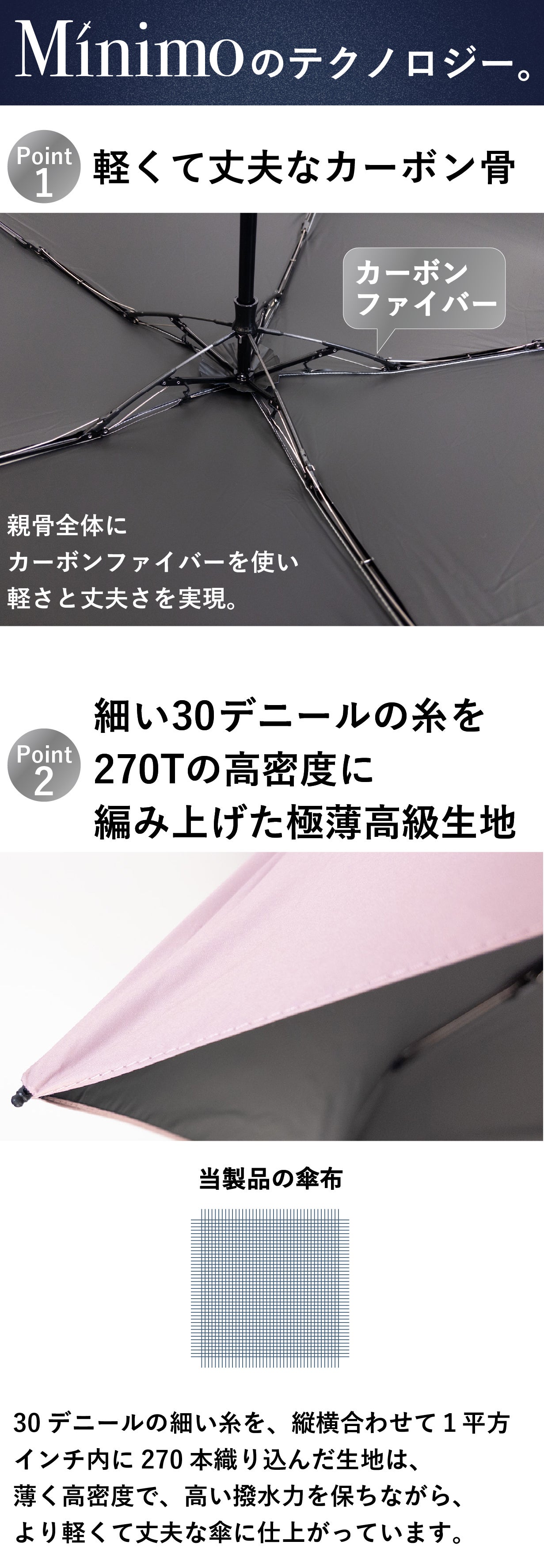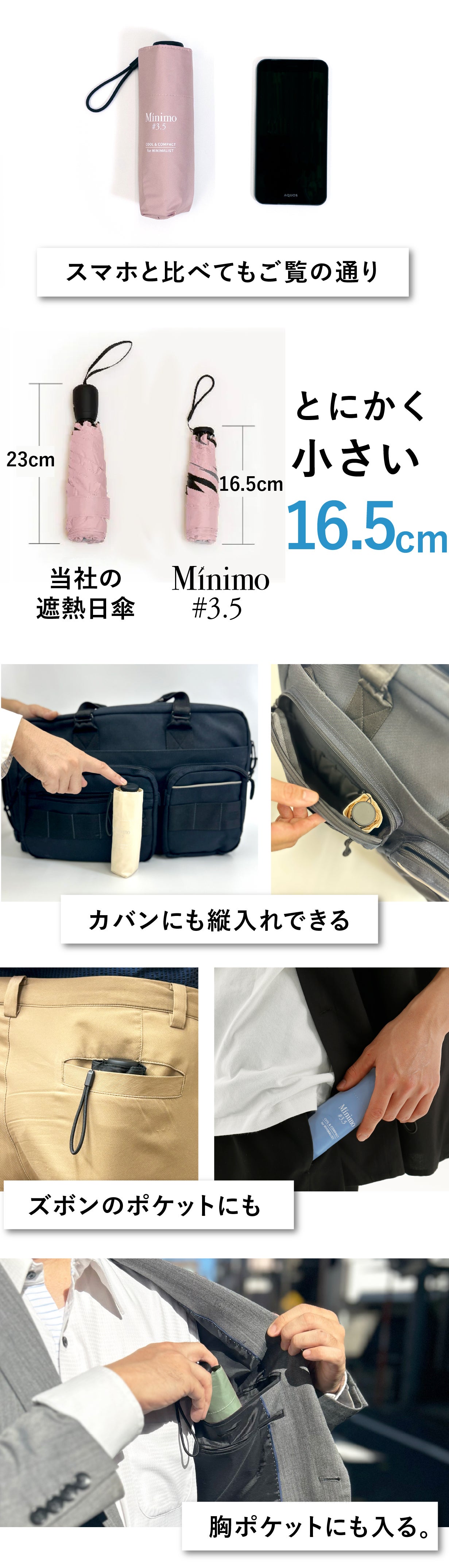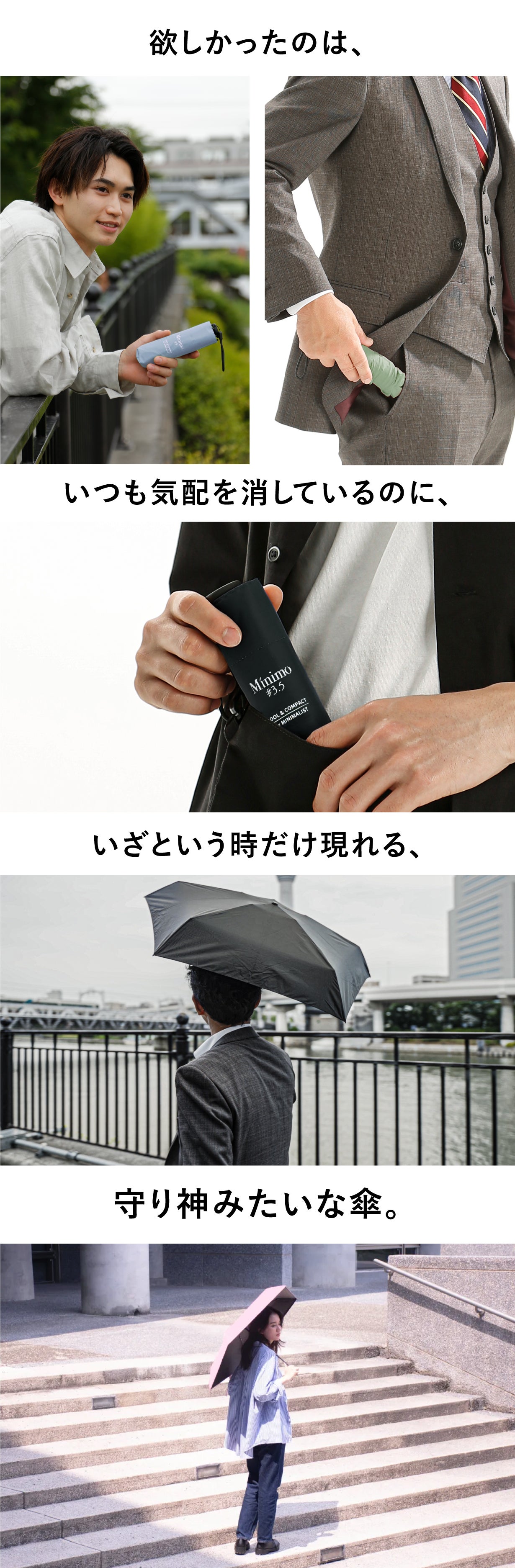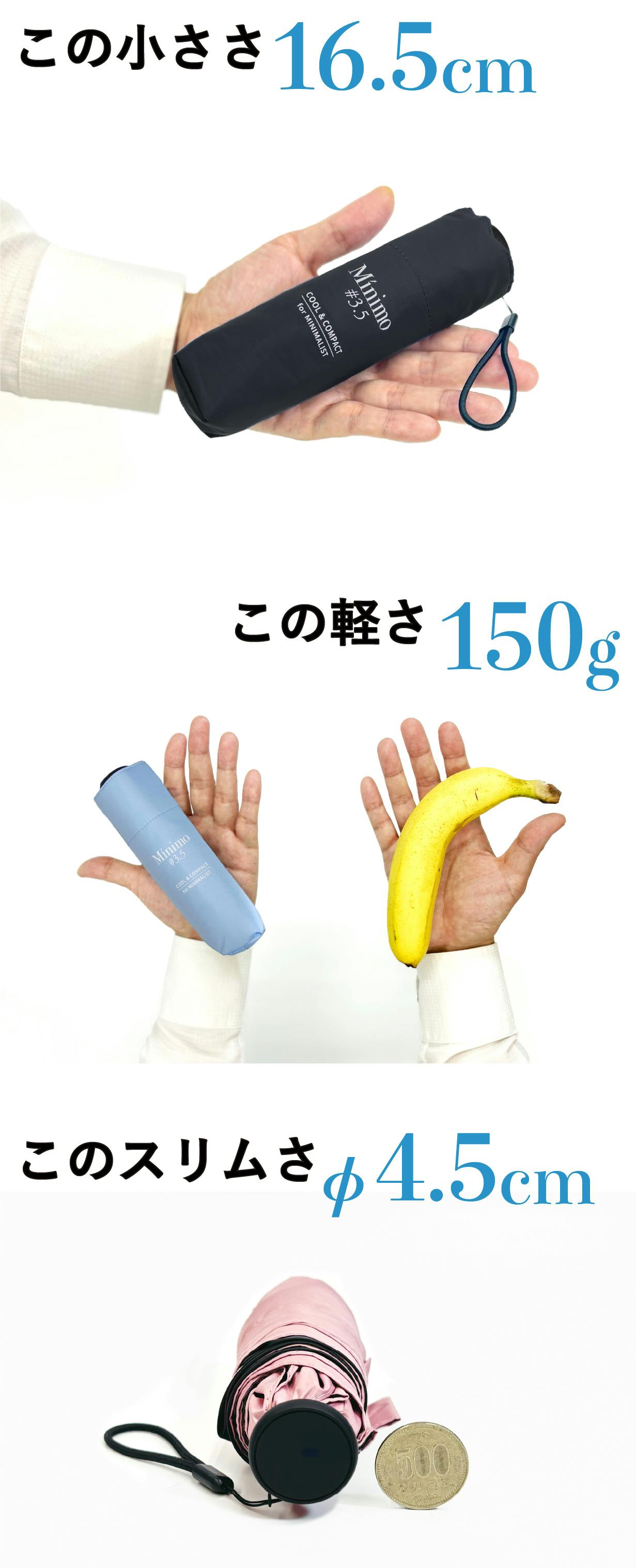 最近は、天気予報も当てにならない時代になりました。そんな中でも、あなたがフットワーク軽く、何の不安もなく外出していただくために、このMinimoシリーズは存在します。是非、このMinimoを鞄に常備して、天候のことなど何も気にせずに、すっきりとした気持ちでお出かけください。