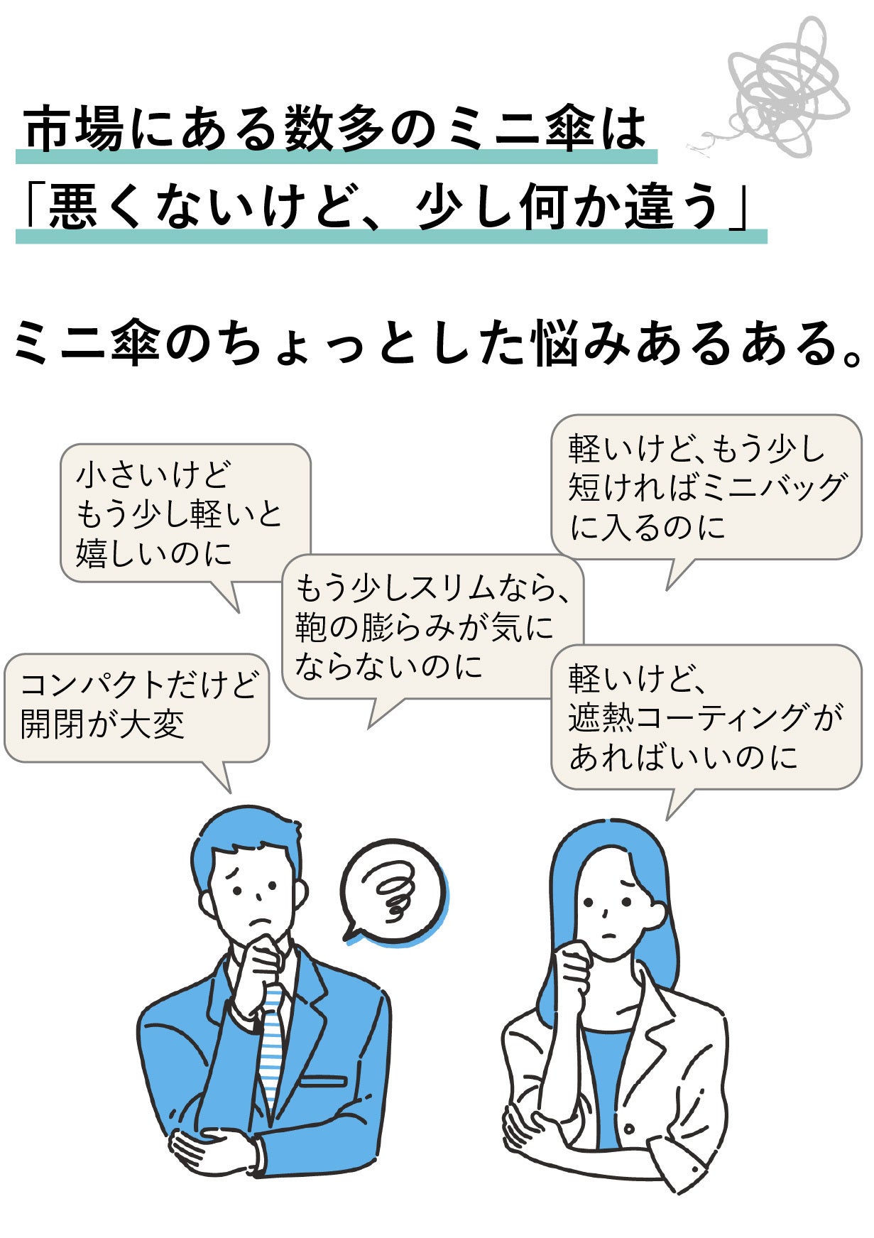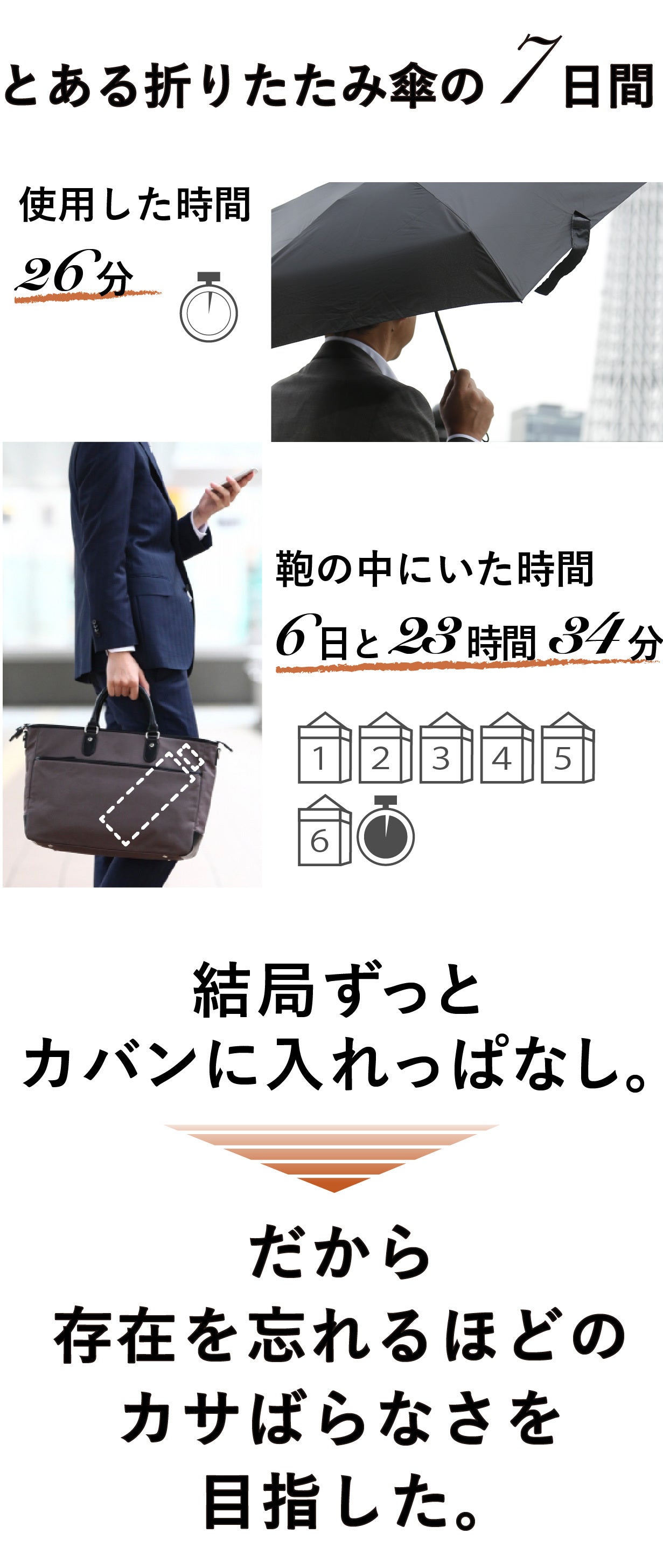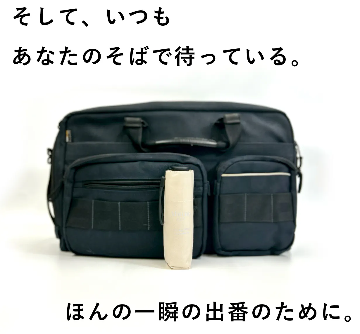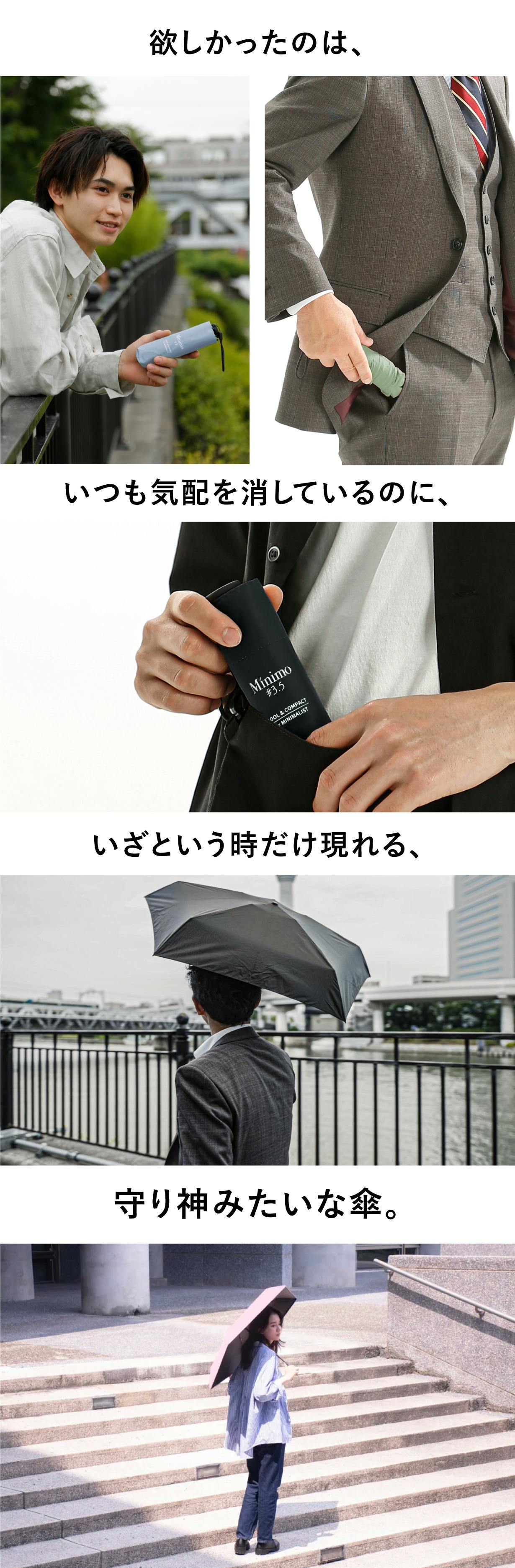 あなたが毎日お使いのミニ傘をはいかがでしょう? すでにそこそこ満足されていると思いますが、「軽くて細いけど、少しだけ長い...」「小さくて薄いけどけど、少し重い...」と、小骨がのどに刺さる感じがありませんか? その微かな違和感のせいで、あなたは「今日は雨が降らなそうだから」と、少しでも荷物を軽くするために鞄から取り出したり、ポーチの厚みが気になって取り出したりします。でもそういう日に限って突然雨が降ってきて、「あぁ、しまった」と思うことはありませんか? 皆さんがそうやって無意識に鞄から取り出してしまうのは、実はこの3要素「小ささ」「軽さ」「細さ」が同時に満たされていないからです。この3つが同時に満たされると、その存在が気にならなくなり、鞄に常に入れっぱなしにしておけるようになります。そうなると、もうお出かけ前に一々天気予報を気にする必要もなくなります。すなわち、あなたが「傘の存在を忘れる」ということは、「毎日の天候を気にしなくなる」ときでもあるわけです。「存在を忘れるための傘」Minimoは、あなたが毎日の気まぐれな天気に煩わされることなく、すっきりとした気分でお出かけいただくための安心感そのものなのです。