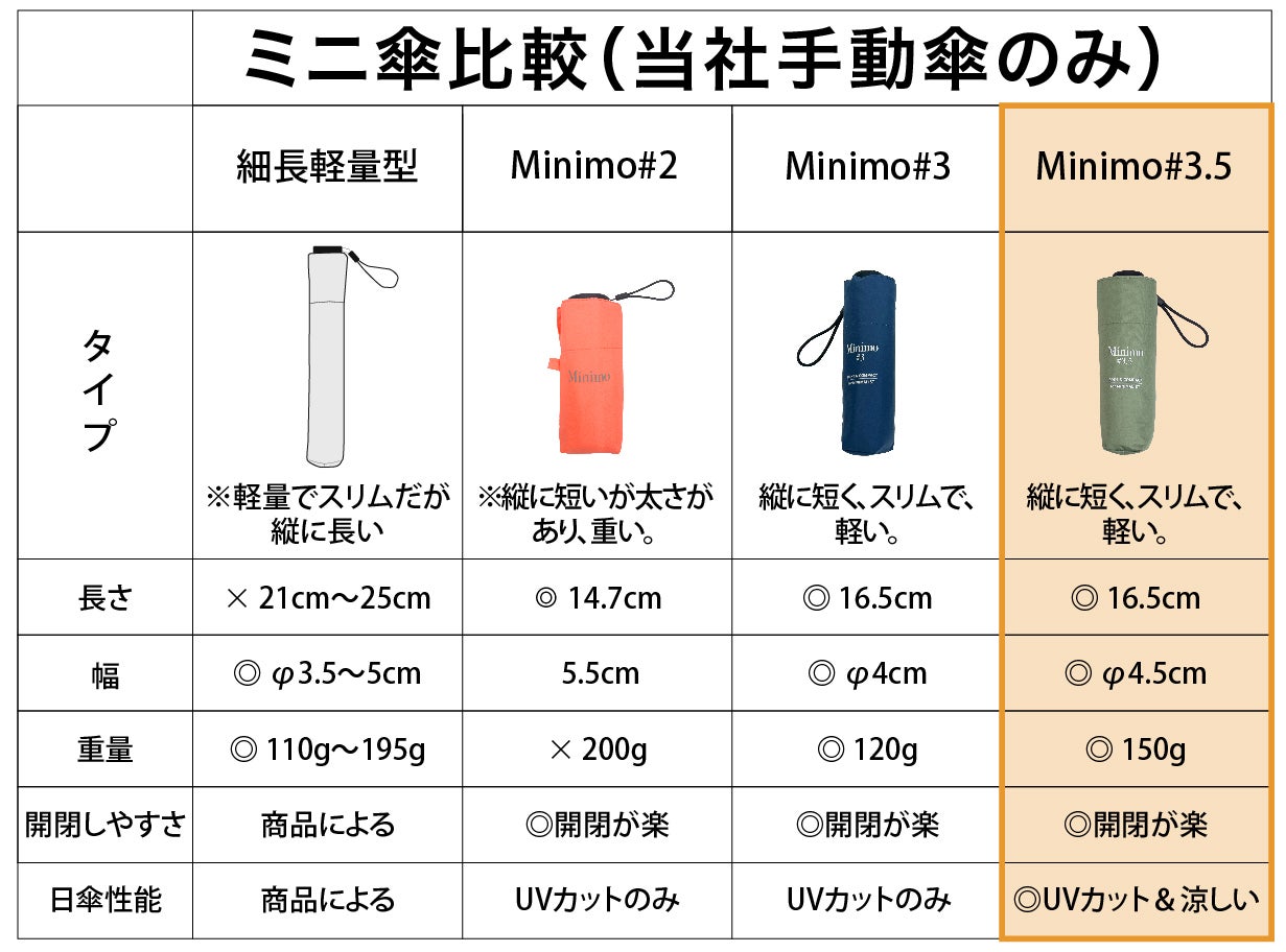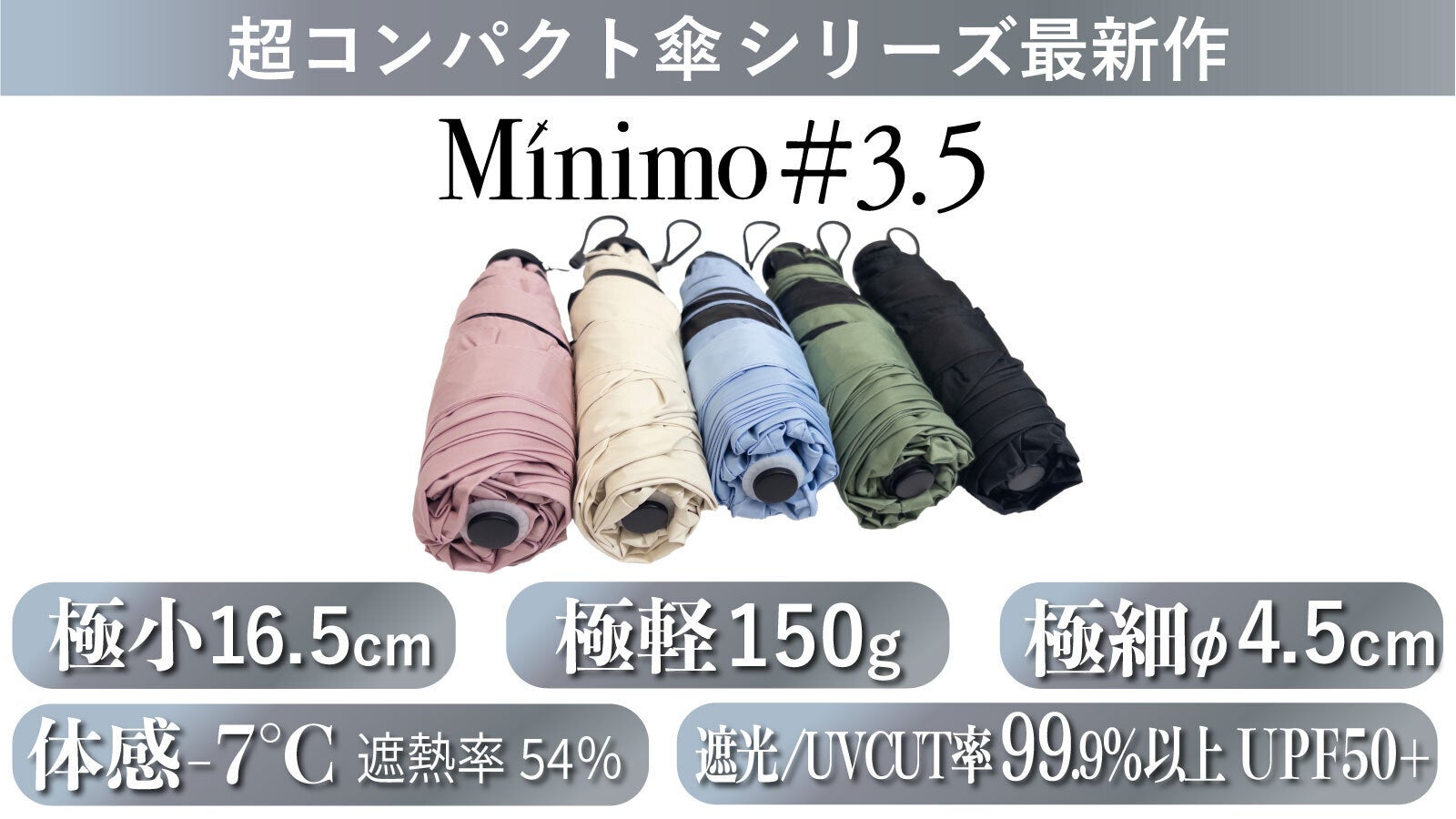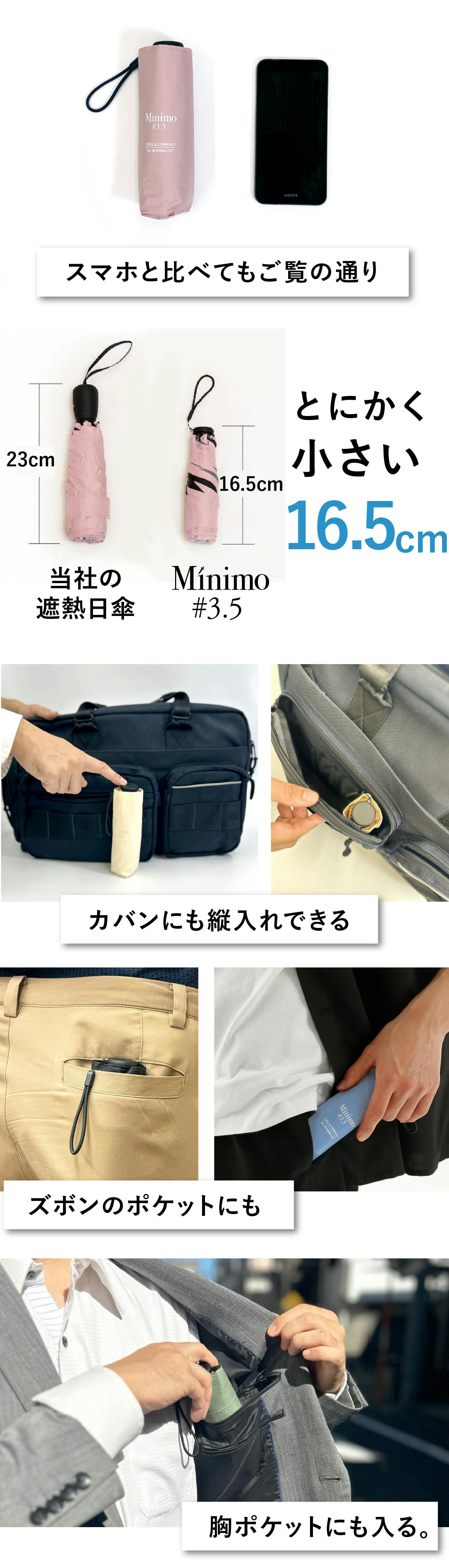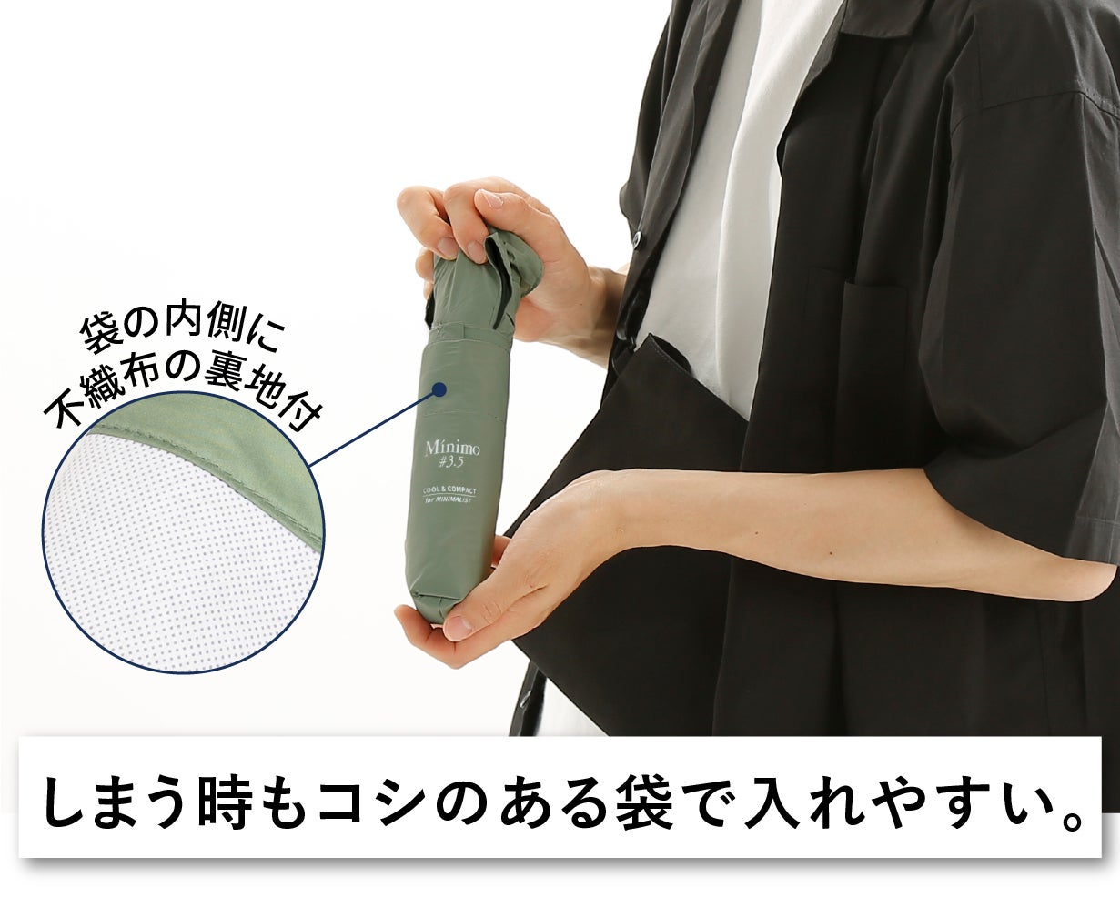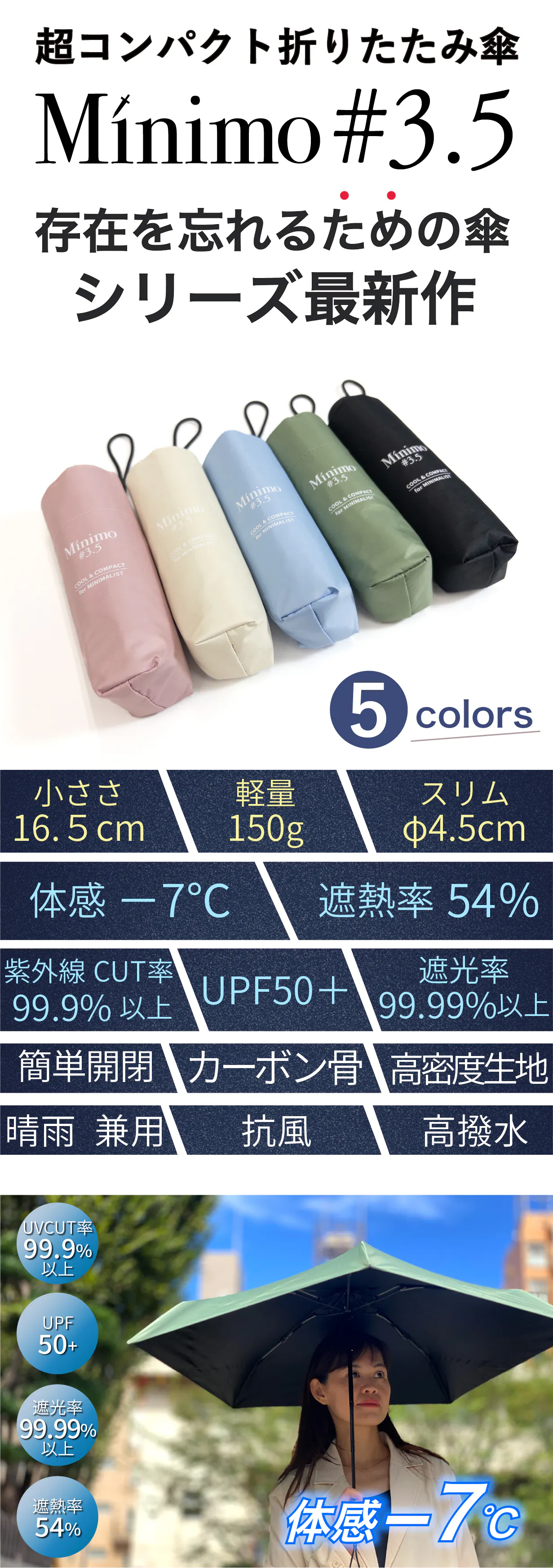 すでにコンパクトさ、軽さ、使いやすさで高みに到達したとも言えるMinimoシリースですが、より日傘としてのニーズが高まった昨今に対応して、さらに半歩先(+0.5)へと歩みを進めました。それがこの「Minimo#3.5」です。骨構造はMinimo#3と同じながら、30gの増量と引き換えに最新の遮熱コーティングを施し、涼しさをも実現した超コンパクト晴雨兼用傘が、ここに誕生したのです。
