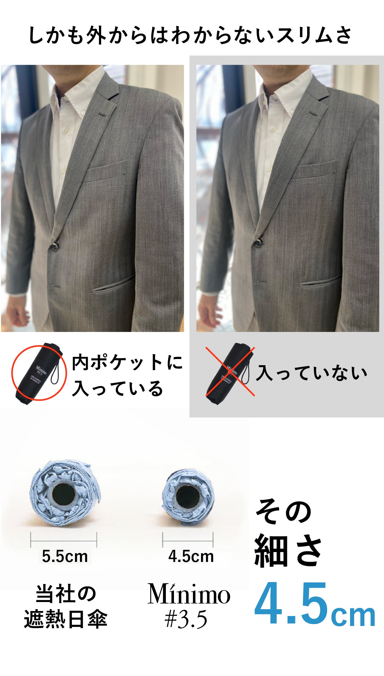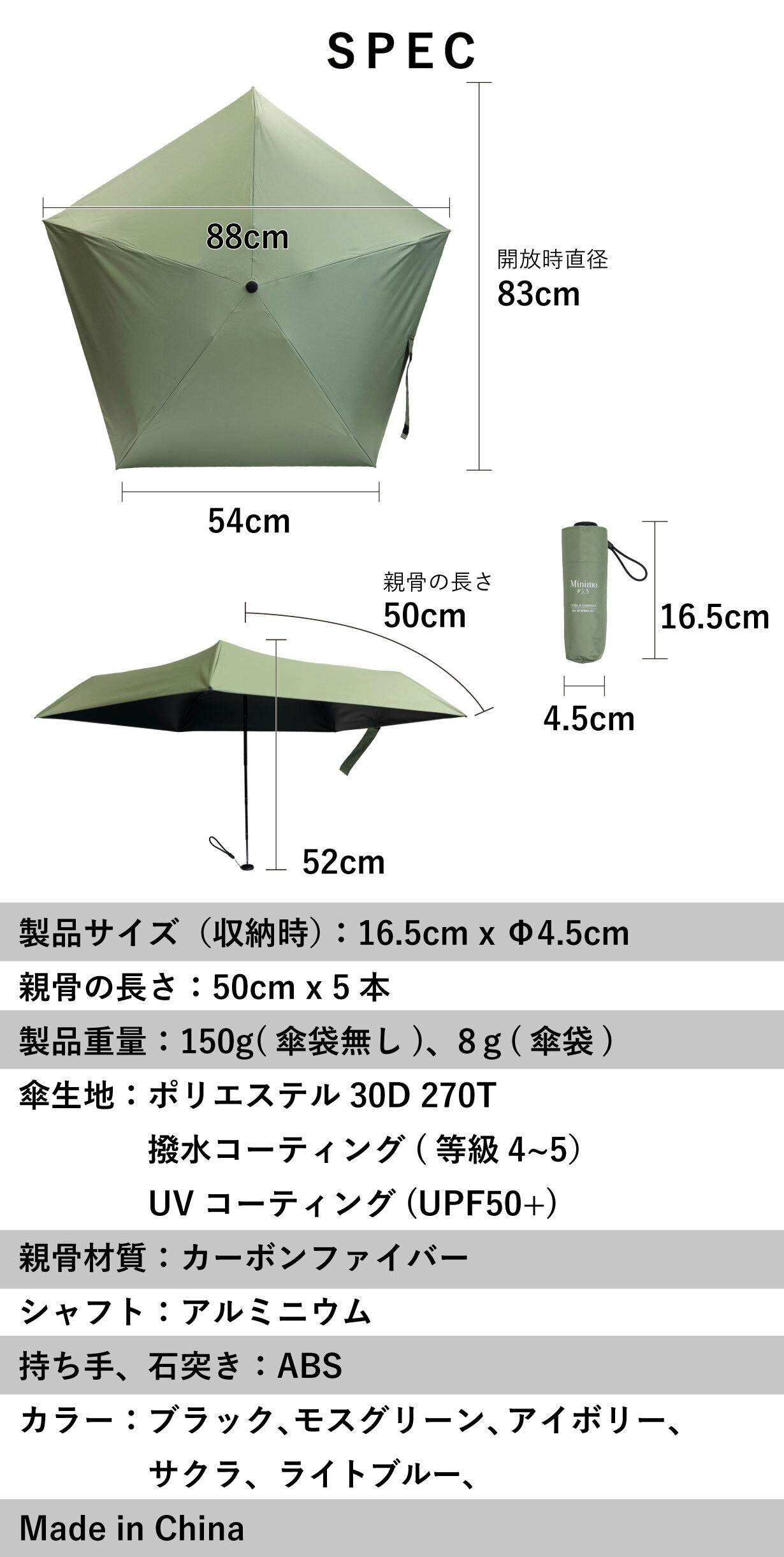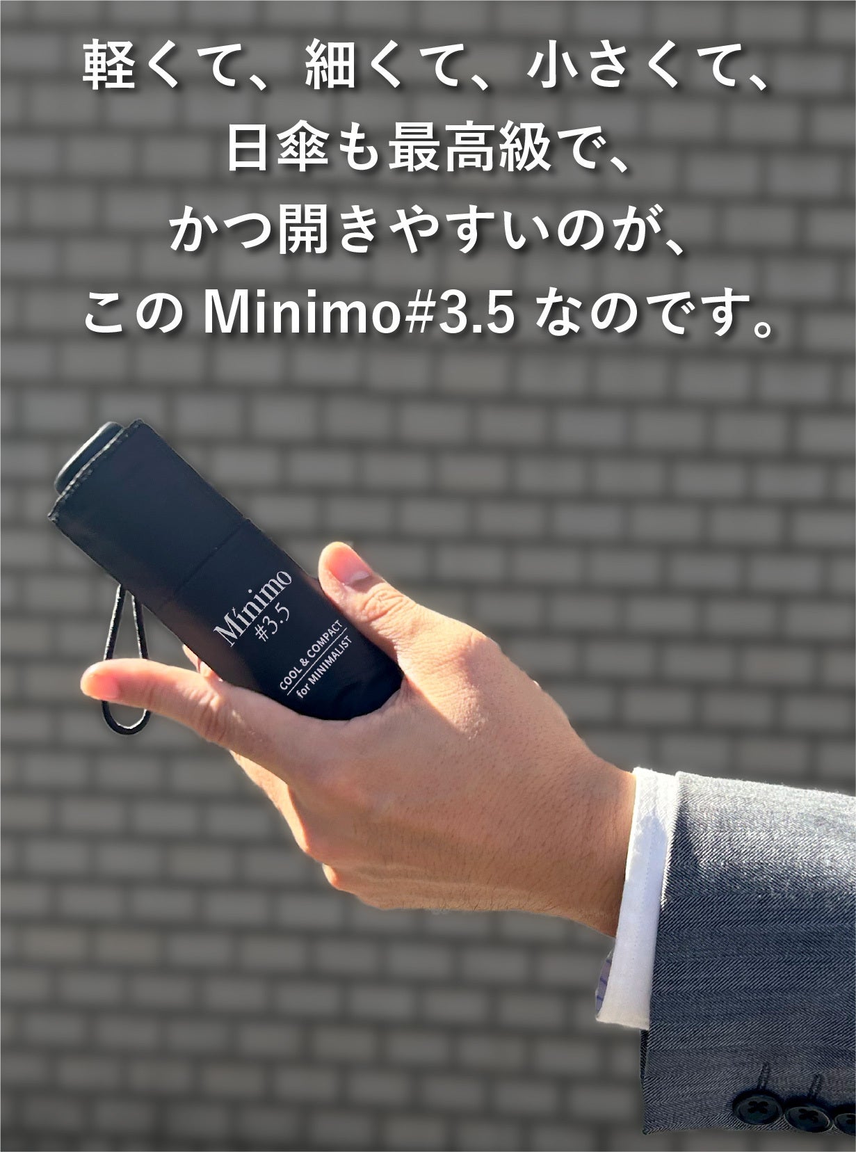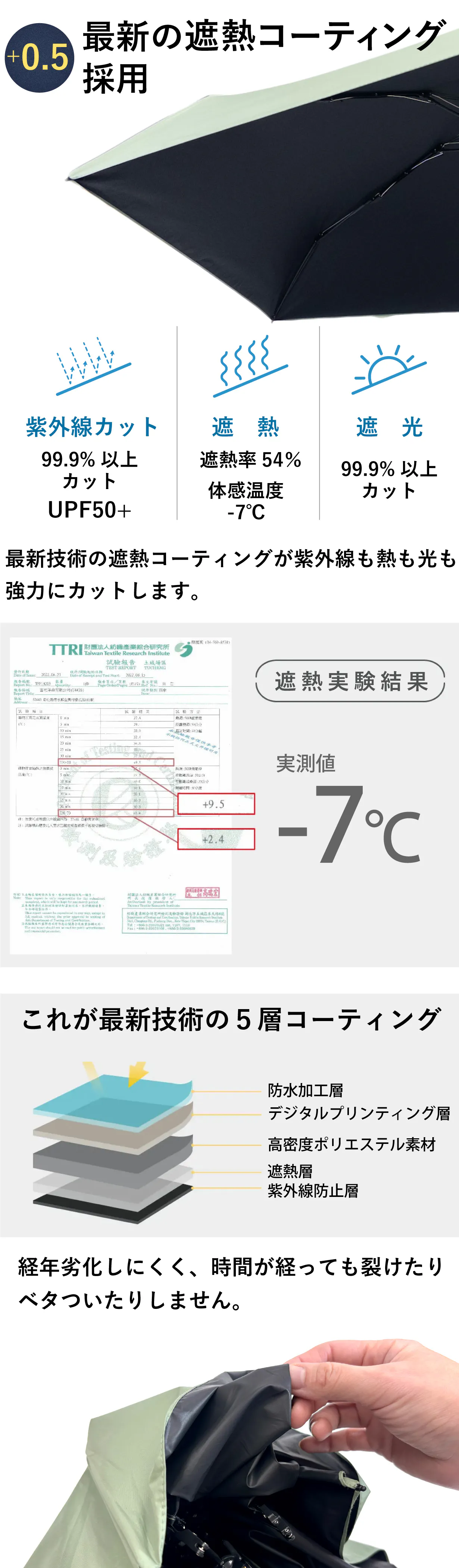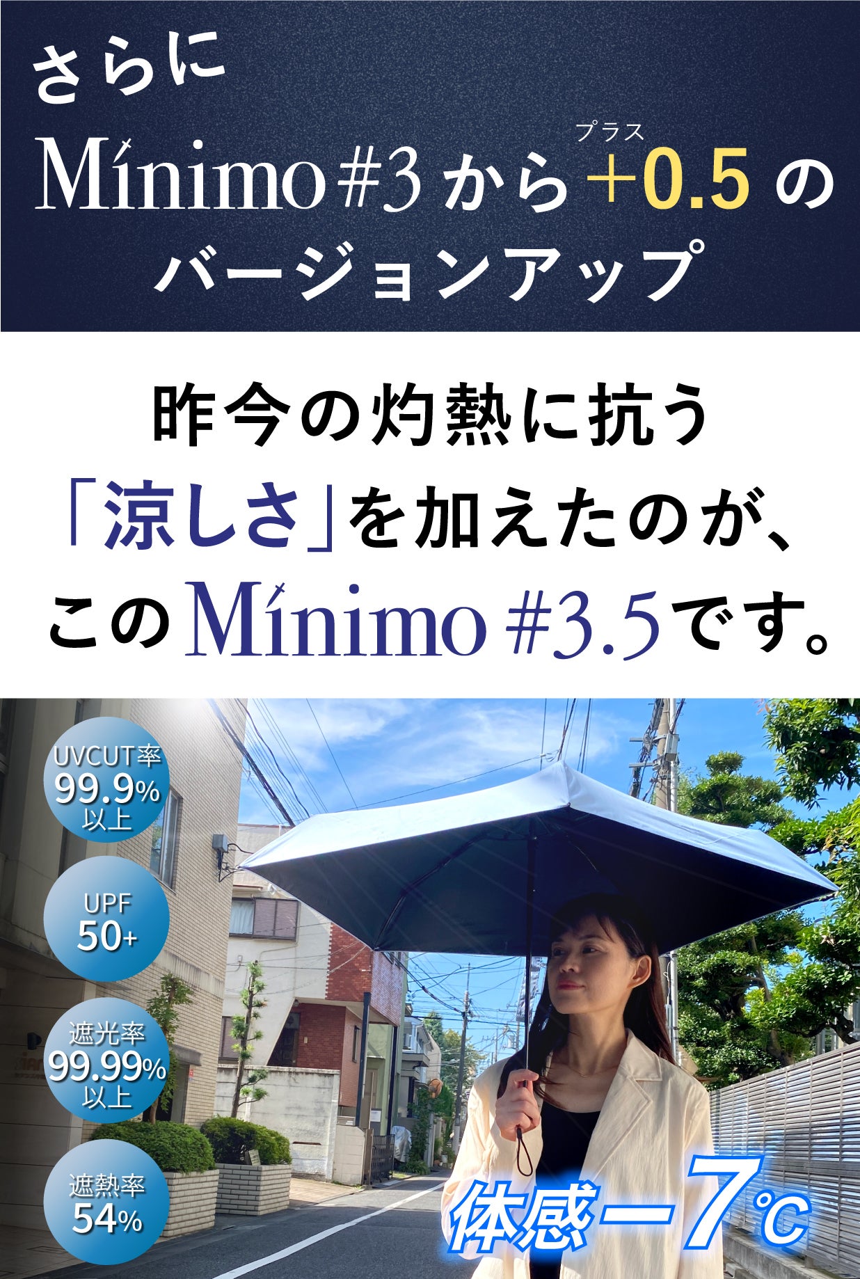 すでにコンパクトさ、軽さ、使いやすさで高みに到達したとも言えるMinimoシリースですが、より日傘としてのニーズが高まった昨今に対応して、さらに半歩先(+0.5)へと歩みを進めました。それがこの「Minimo#3.5」です。骨構造はMinimo#3と同じながら、30gの増量と引き換えに最新の遮熱コーティングを施し、涼しさをも実現した超コンパクト晴雨兼用傘が、ここに誕生したのです。