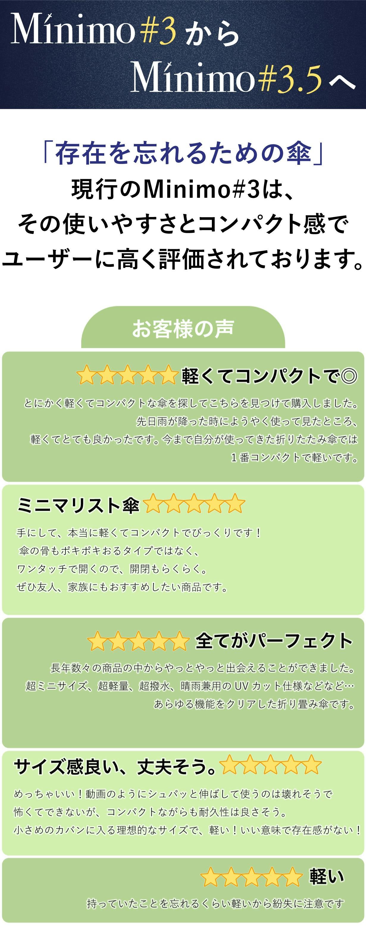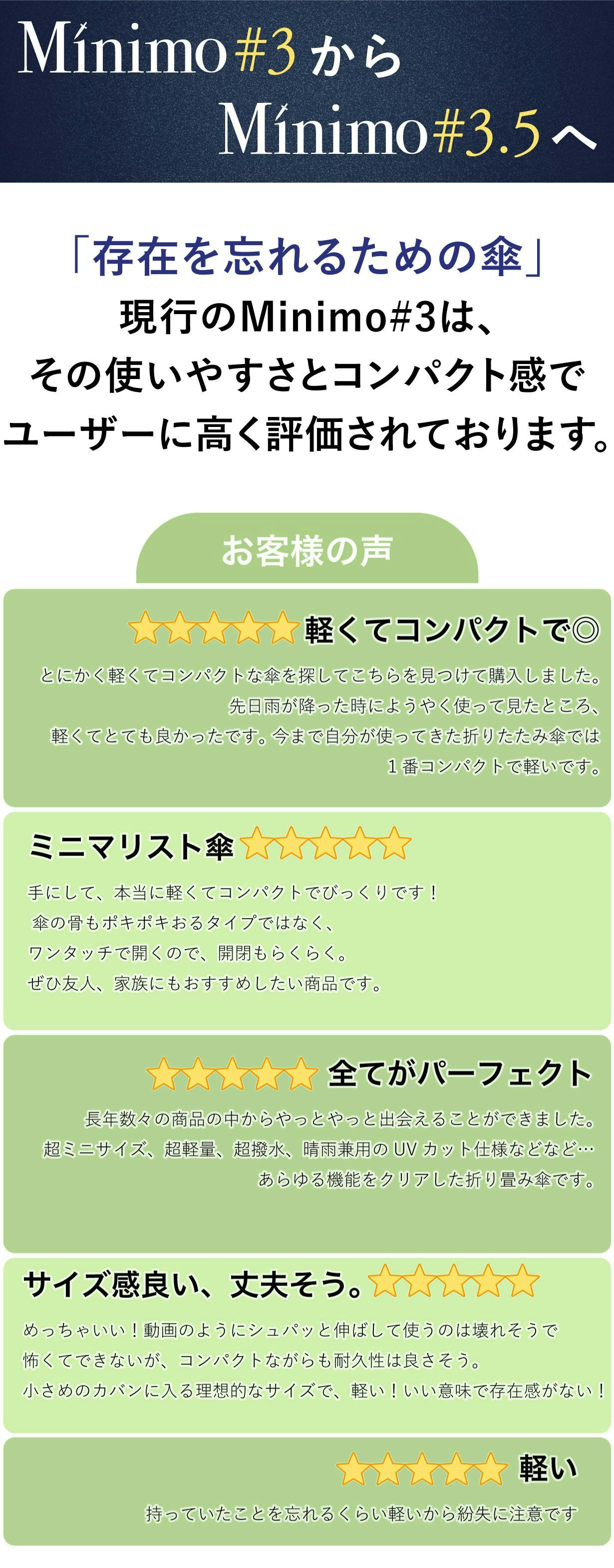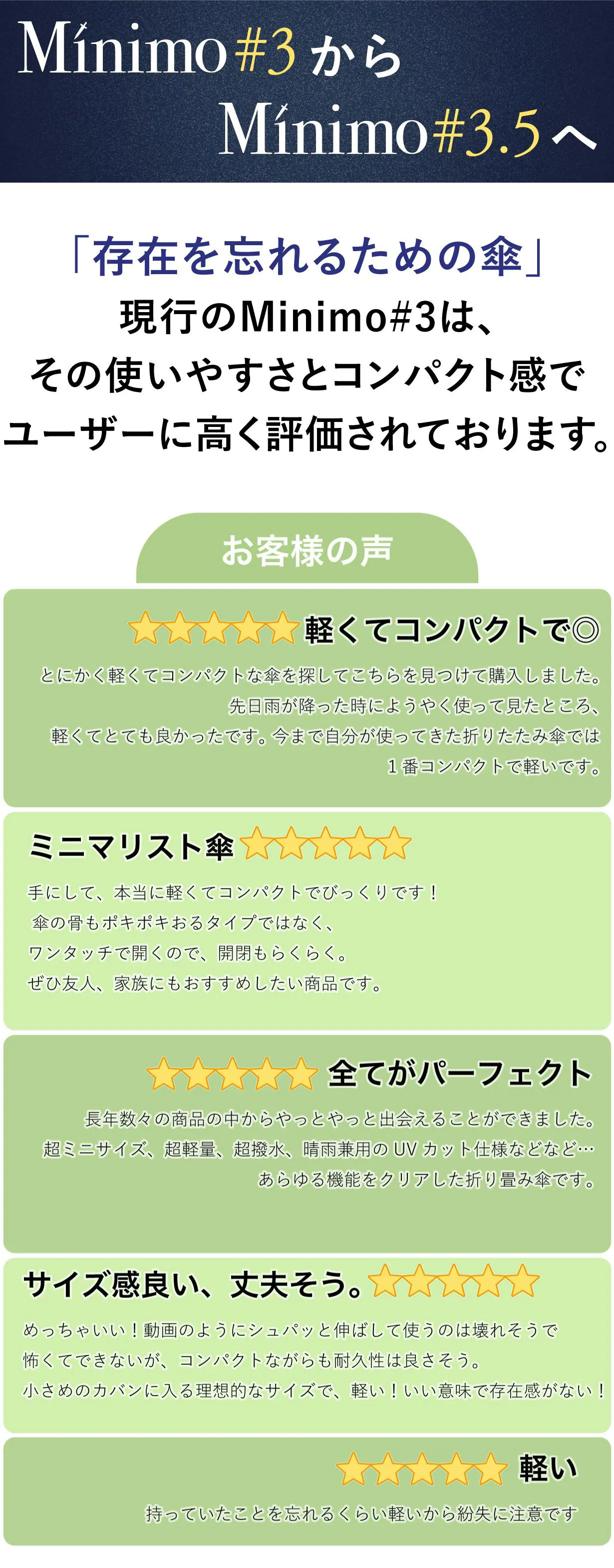 さらに、通常のコンパクト傘は、沢山の折り関節のせいで、通常の開閉もひと手間かかりスムーズにはいかないものです。ところがMinimo#3.5は開閉もすんなり。この「開閉しやすさ」という要素も加えると、4要素を高次元で満たす傘は、Minimo以外には、ほぼ存在しないといえるのではないでしょうか?