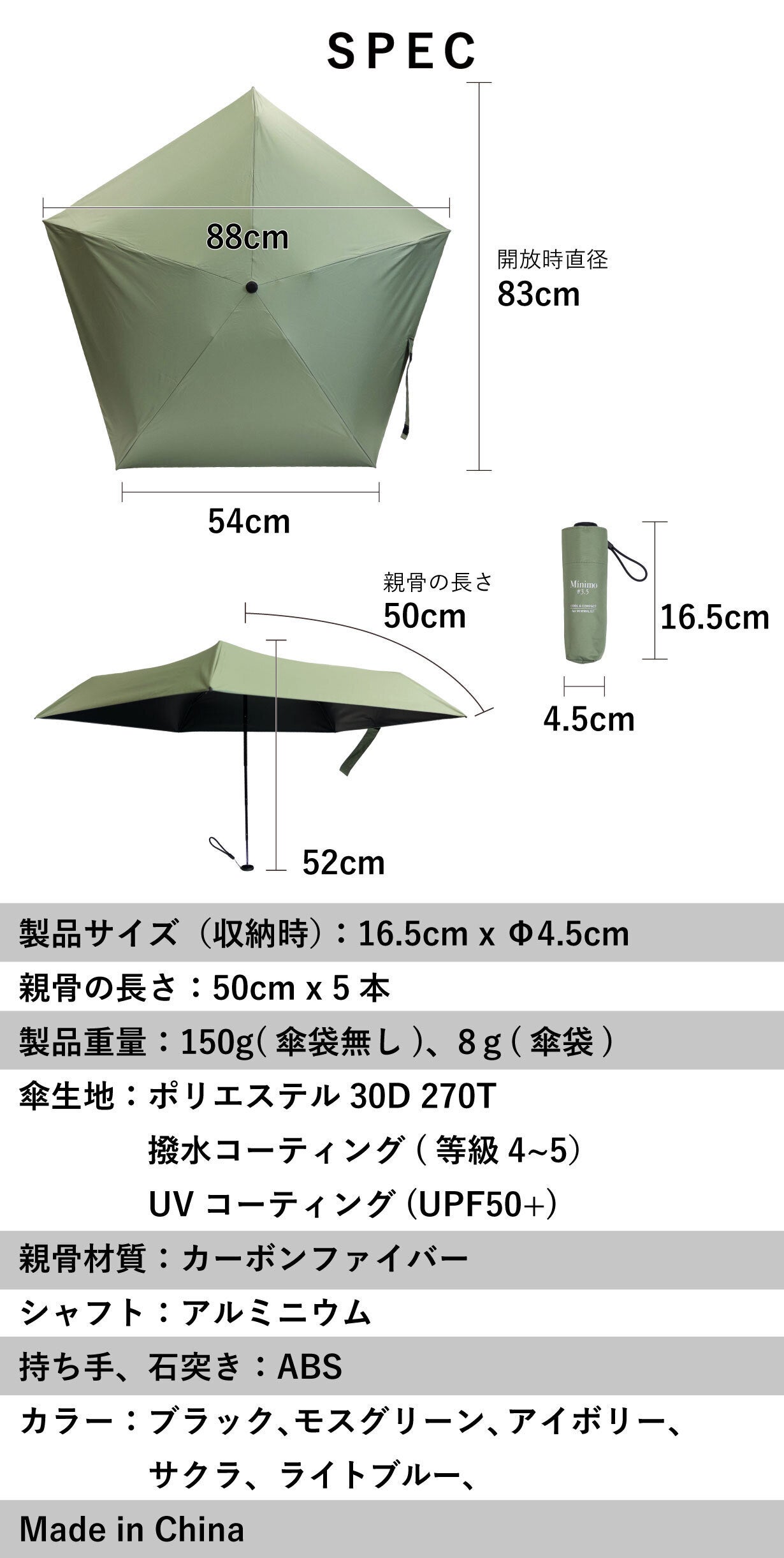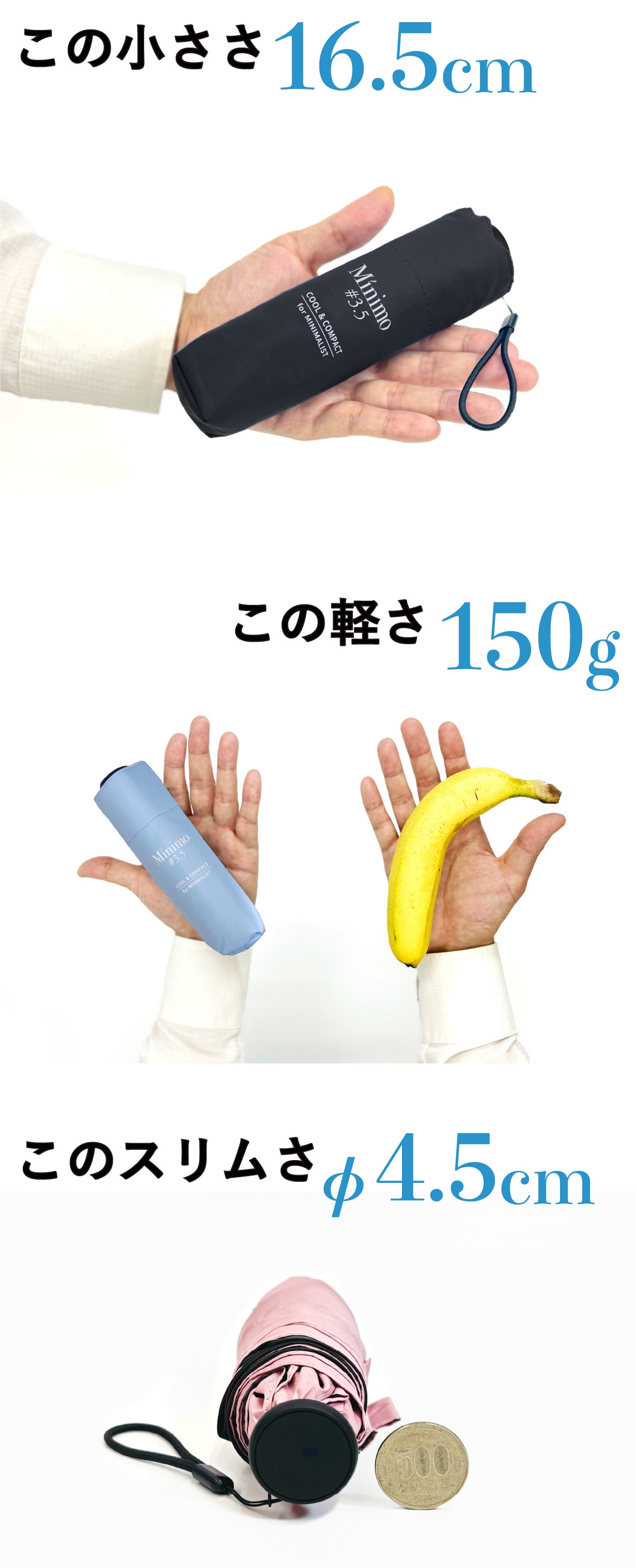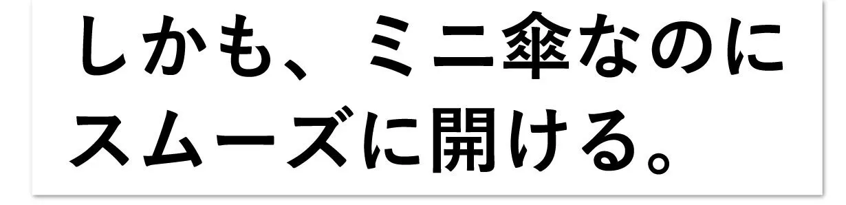 さらに、通常のコンパクト傘は、沢山の折り関節のせいで、通常の開閉もひと手間かかりスムーズにはいかないものです。ところがMinimo#3.5は開閉もすんなり。この「開閉しやすさ」という要素も加えると、4要素を高次元で満たす傘は、Minimo以外には、ほぼ存在しないといえるのではないでしょうか?