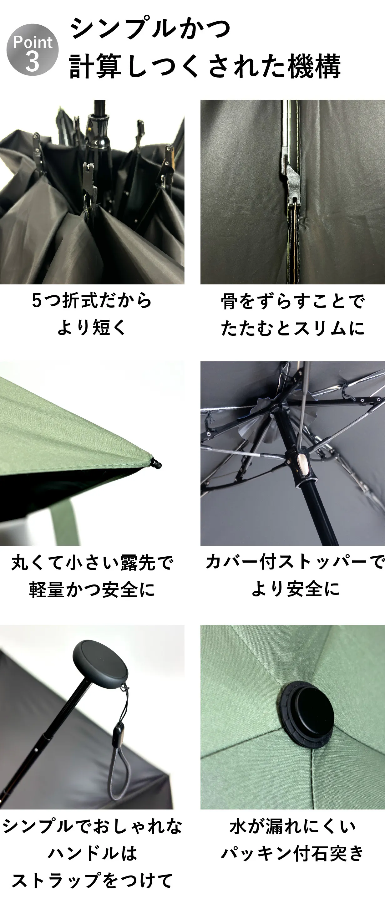 コンパクト傘を比べる上で外せないのは「小ささ」「軽さ」「細さ」の3要素。でもこの3要素を同時に最小化するのは実は非常に難しいのです。というのも折りたたみ傘を小さくすればするほど、その折り関節が増えていき、より太く、より重くなってしまうからです。