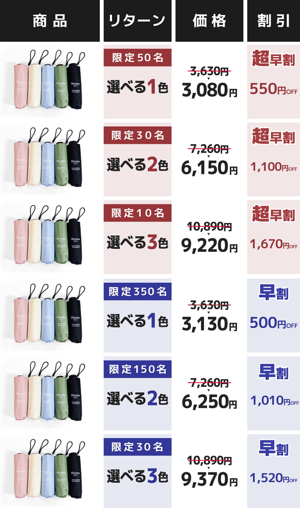 2026/03/25 13:58いつも温かいご支援をいただき、本当にありがとうございます。ご支援者の皆様へ、新しいプロジェクトのご紹介です。「傘の持ち手が扇風機に!? 扇風機がハンドルの折りたたみ日傘 登場」傘の持ち手と扇風機が一体になった、ユニークで実用的な折りたたみ日傘です。傘とファンを別々に持つ必要がなく、片手1本で使えるので、暑い日の外出をより快適にしてくれます。さらに、日傘としての機能もしっかり備えています。UVカット率100%、遮光率100%の晴雨兼用傘で、日差しの強い日にも安心です。【主な仕様】・重量:黒 295g / 白 320g・開放時直径:96cm・風力:3段階調整・晴雨兼用リターンは、4,440円(1,060円オフ)からご用意しています。ご興味をお持ちいただけましたら、ぜひプロジェクトページをご覧いただけますと嬉しいです。これまで応援してくださった皆様に、今回もまず最初にお知らせしたく、ご案内をお送りしました。▼プロジェクトページはこちらhttps://camp-fire.jp/projects/929470/preview引き続き、どうぞよろしくお願いいたします。 もっと見るMinimo#3.5 発送完了!