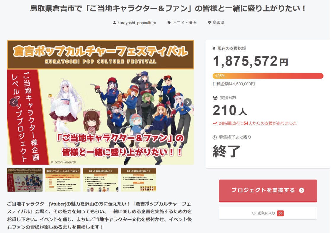 2025/02/01 09:56こんにちは。倉吉ポップカルチャーフェスティバル運営です。昨夜、約1か月間におよぶクラウドファンディングが終了しました。皆様のご支援と応援により、目標を大きく上回る「1,875,572円」での着地となりました。本当にありがとうございました。最終日には、なんとCAMPFIRE全体の「アニメ・漫画」カテゴリーの人気ランキングでも、堂々一位となっておりました。皆様の期待にお応えでできるように、まずはイベント当日をめいっぱい楽しんでいただけるように、準備を頑張っていきます。また、ページ冒頭にも書きましたように、ご当地キャラクター(Vtuber)様の魅力を沢山の方に伝えるため、その魅力を知ってもらい、ファンの皆様も一緒に楽しめるような企画を実施していきます。さらにイベントを通じ、まちにご当地キャラクター文化を根付かせ、イベント後もファンの皆様が楽しめることを目指します!この目標を達成するために、同じ志をもつ仲間として皆様のご助力を頂ければ嬉しく思いますので、引き続きよろしくお願いします!※返礼品については、これから手配を進めますので、ご到着を楽しみにお待ちください。 会場で掲示する幟についても、順次連絡させて頂きますので、少々お待ちください。 もっと見る