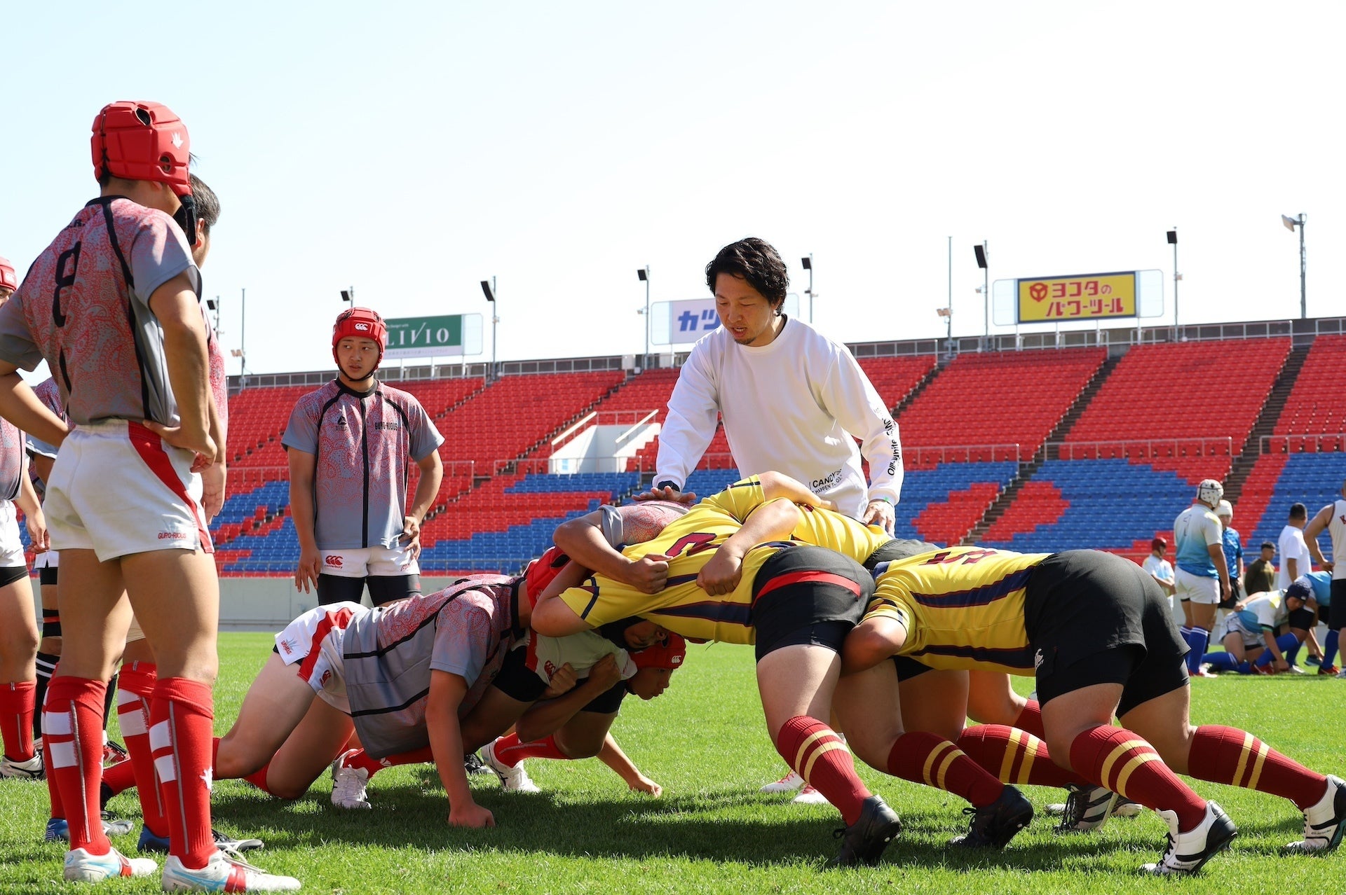 当日は、ジャパンラグビーリーグワンの花園近鉄ライナーズやコベルコ神戸スティーラーズの現役選手やコーチ、元日本代表の選手も一緒に汗を流してくださっています。