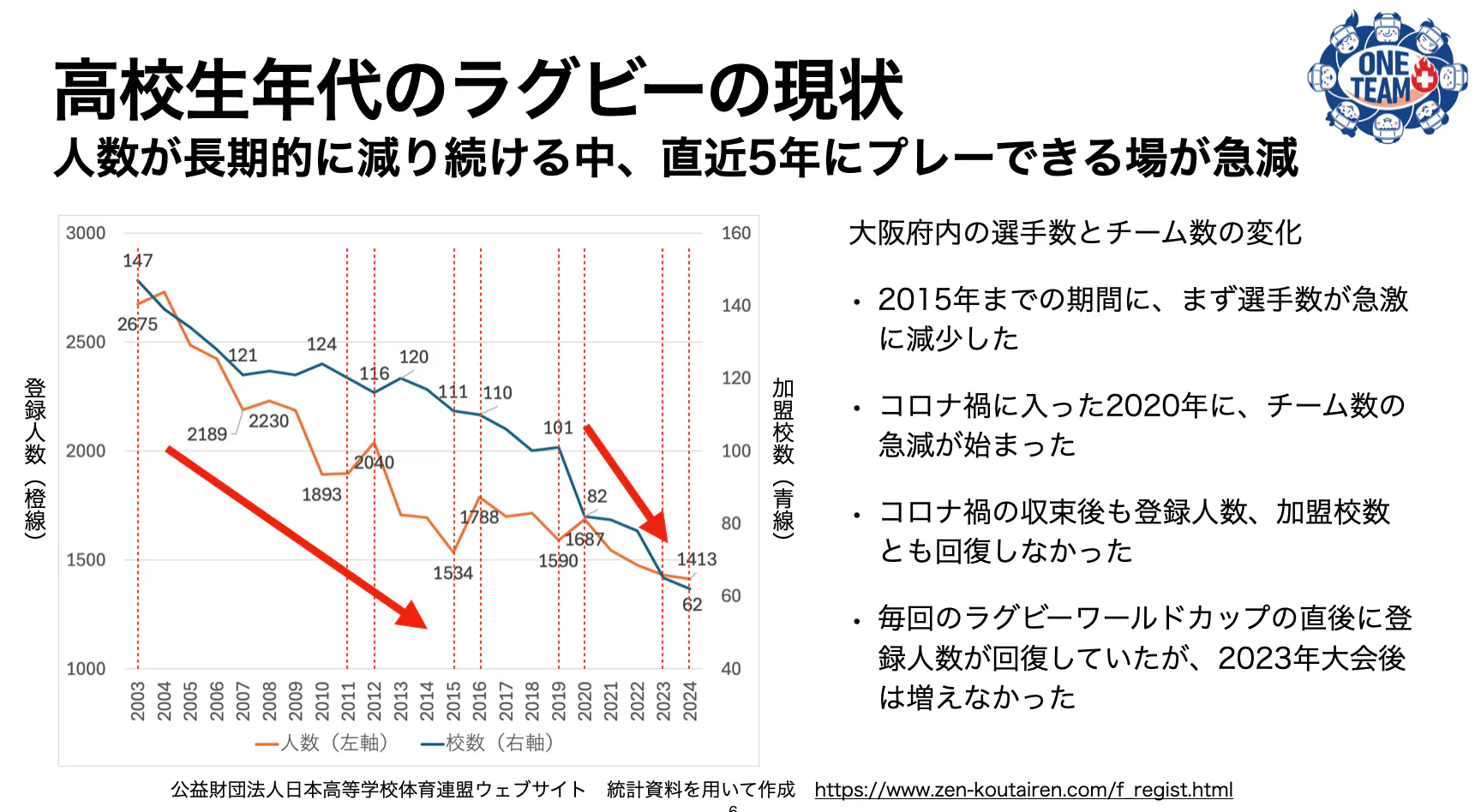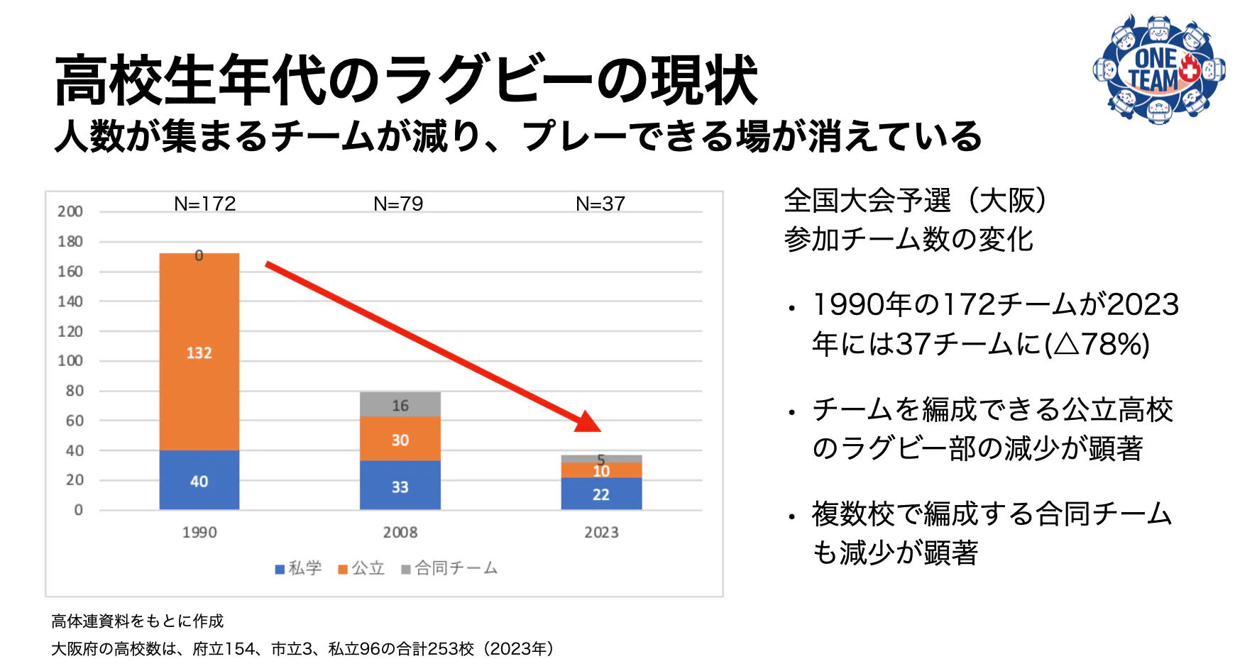 しかし、子供の数が減る→15人のチームを組めるラグビー部の数が減る→休部廃部でチームが減る→ラグビーをするきっかけが減る…こんなサイクルが回り続けた結果、大阪府の全国大会予選に出られるラグビー部の数は1990年から2023年までの30年余りで172から32にまで減りました。公立校に限ると132から10です。その結果、選手の数も激減。少数の私立校に集中しました。ラグビーはもはや、高校で出会って始められるスポーツではなくなりました。