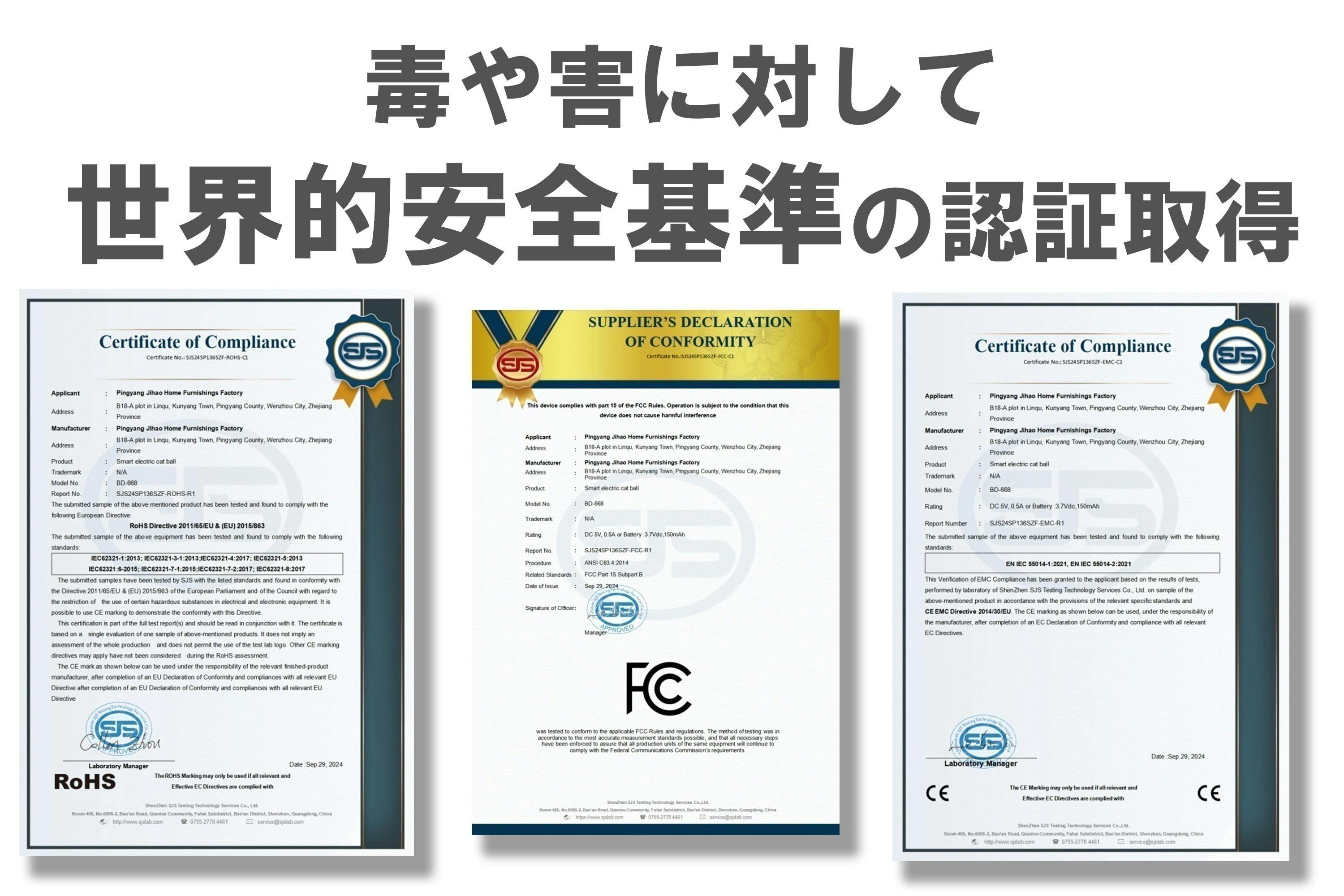 口に入れる物なので安全性に配慮しました。日本のJ-Mossグリーンマークより厳しいRoHS認証など、3種の認証を取得し国際的な基準を満たしており、素材の毒や害に対しての安全基準を証明しております。