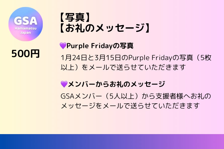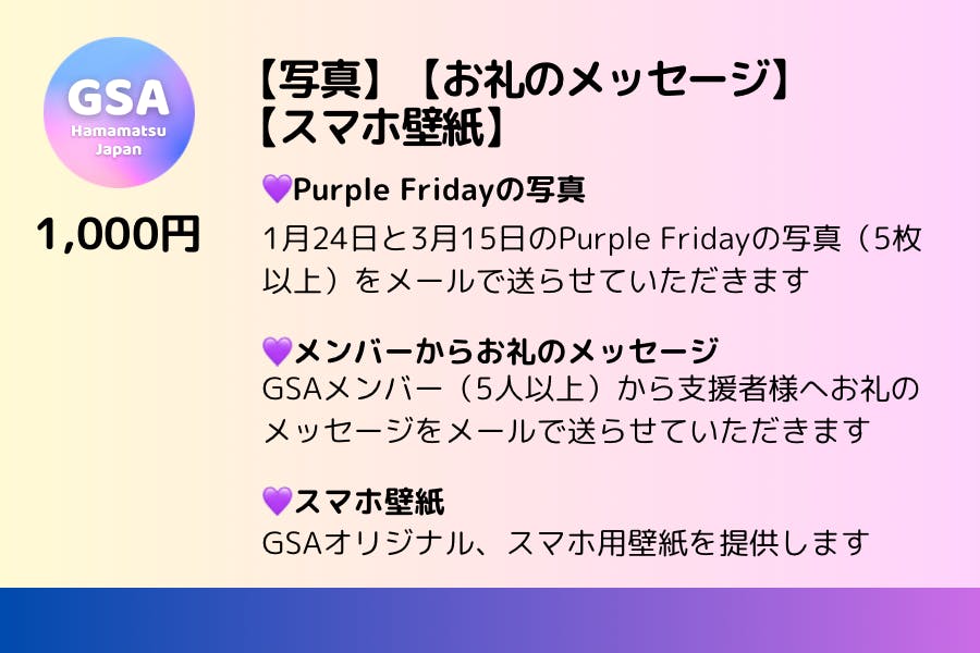 5,000円以上支援してくださった方にはGSAメンバーとのお話し会があります。日にちや聞きたいことをメールにて送ってくださいますととても嬉しいです。