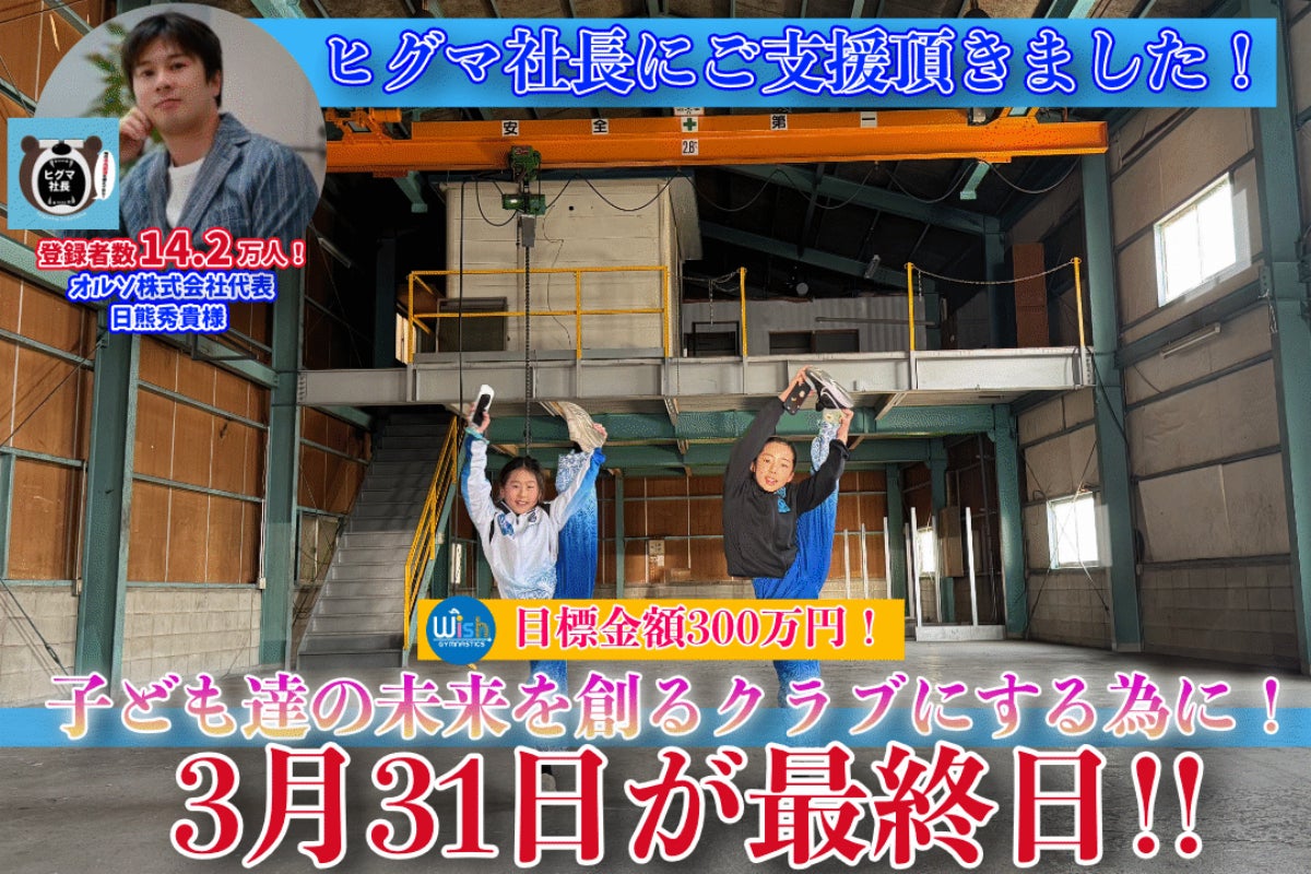 2025/06/04 15:27新店舗の移転や旧店舗の撤去の作業に忙殺され、近況の報告を投稿できておらず申し訳ありませんでした。GW明けからレッスンを再開し、その合間に旧店舗の撤去を行なっておりました。完全に何もなくなりました。生徒たちが練習していた体育館の原型はこんな形でした。そして本日鍵をお返しし、無事旧店舗の撤去は完了となりました。新体育館も無事空調設備が整い、暑い日も熱中症の心配もなく練習することができるようになりました。【リターン品の発送について】引越しがひと段落しましたので、改めてリターン品の発送を随時進めてまいります。リターン品の一部(木製プレート)についてはすでに教室玄関に飾らせていただいております。・オリジナルポーチ・オリジナルタオル・Tシャツ・教室解放チケット・4回分レッスンチケットについては発送準備が整った時点で随時発送させて頂きます。 尚Tシャツにつきましては発注業者さんの兼ね合いもあり、一番最後のお届けになってしまうかと思いますので、到着まで今しばらくお待ちください。最後になりますが、この度は当クラブのクラウドファンディングに温かいご支援を賜り、本当にありがとうございました。お預かりさせて頂いた支援金の使途の明細は後日活動報告にてお知らせさせて頂きます。移転中に選手たちの試合がありました。不遇な環境の中で精一杯演技してきましたので、よかったらご視聴ください! もっと見る