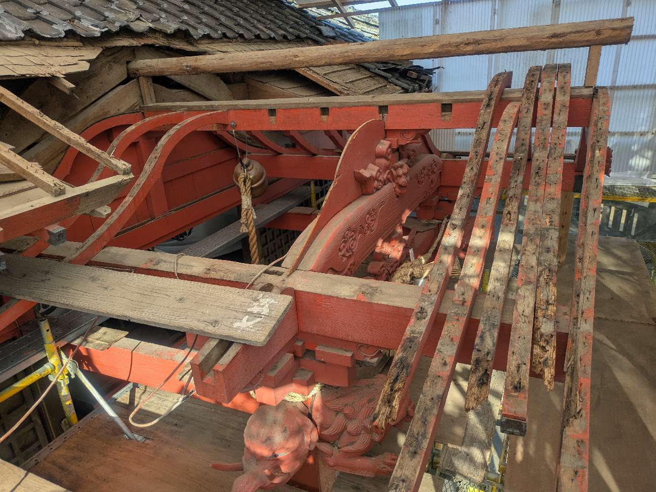 仮屋根を組んで、雨天時でも濡れないようにして工事しています。