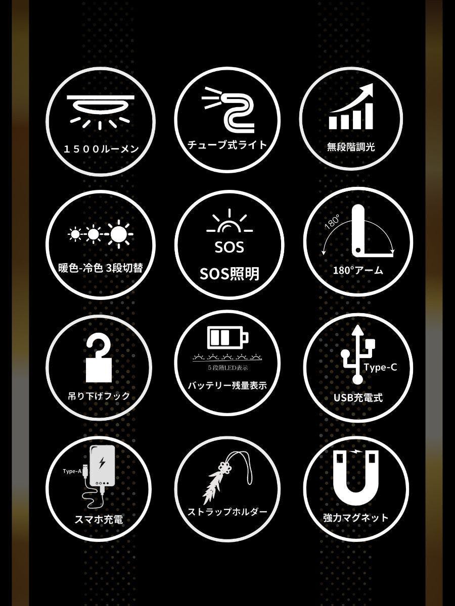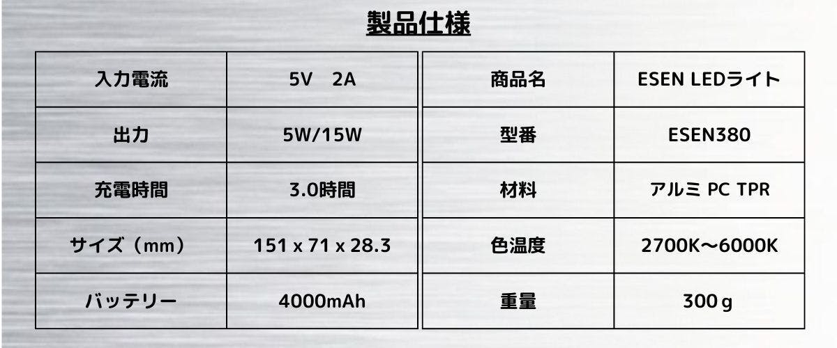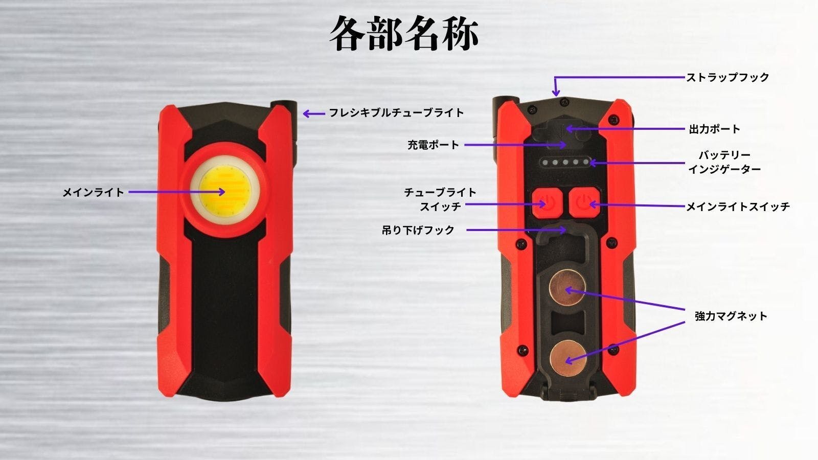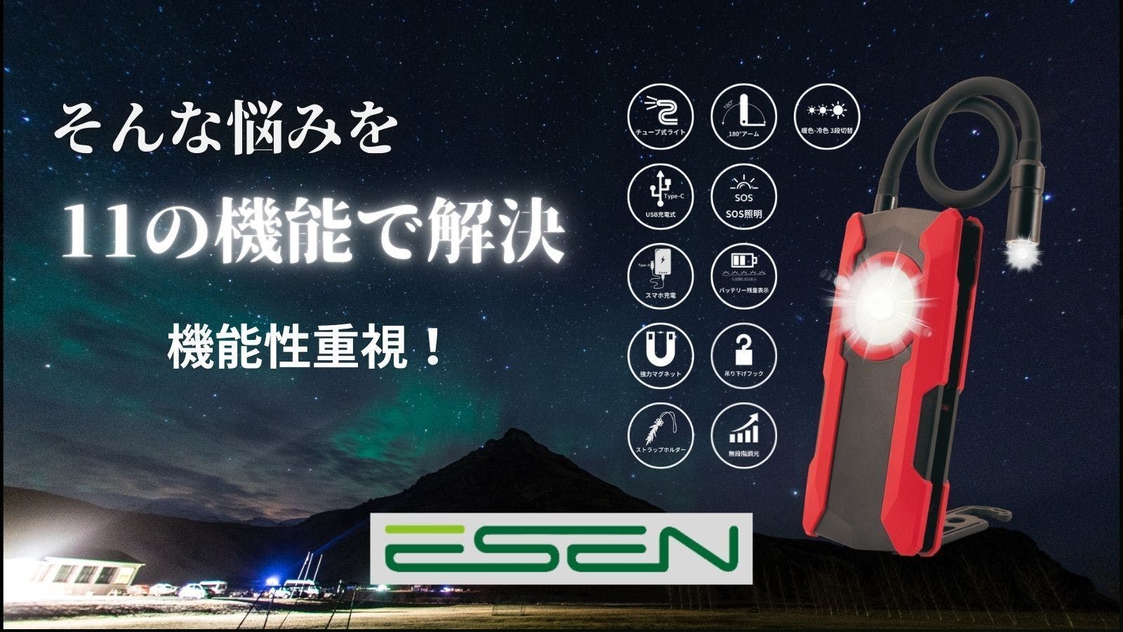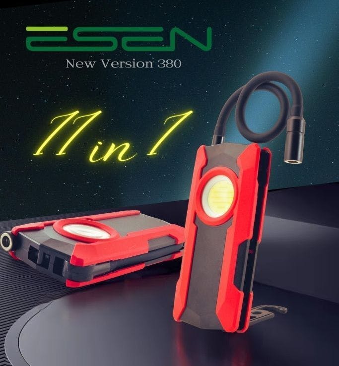 この『ESEN 380 LEDワークライト』にはメインのライトとフレキシブルチューブライトの2つが装備されており、あらゆる場面で最適な照明を提供します。11個の機能を備え、使い易さを追求した設計となっています。中でもフレキシブルチューブライトとモバイルバッテリー機能は大変人気が高いです。