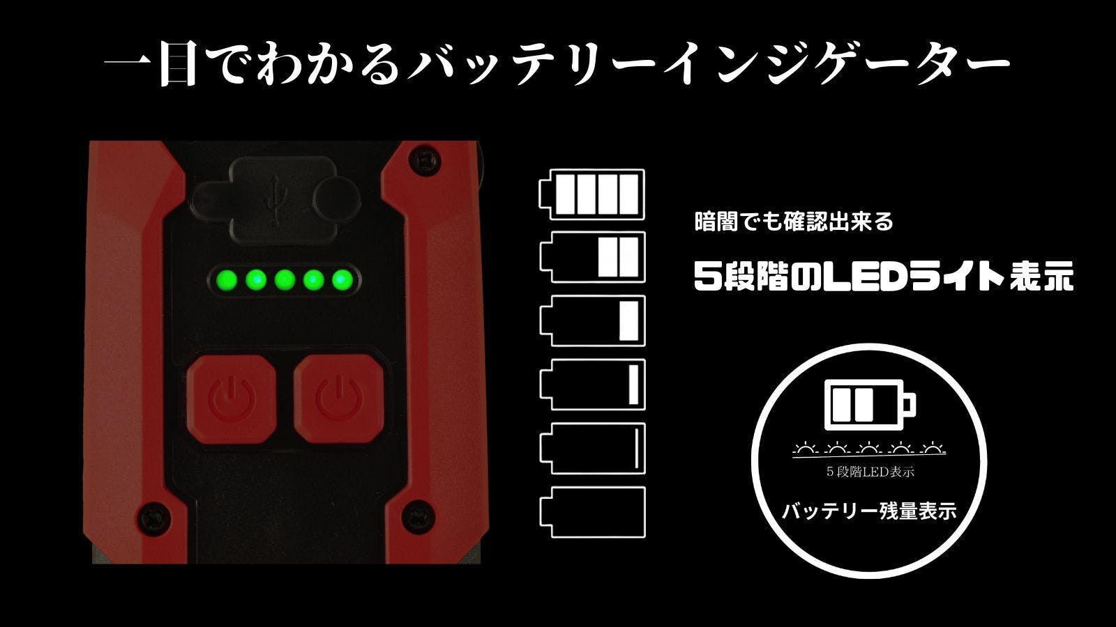 バッテリーの残量がわかる5段階のLED表示ランプ機能付き! 暗い中でもバッテリー残量が一目でわかります。