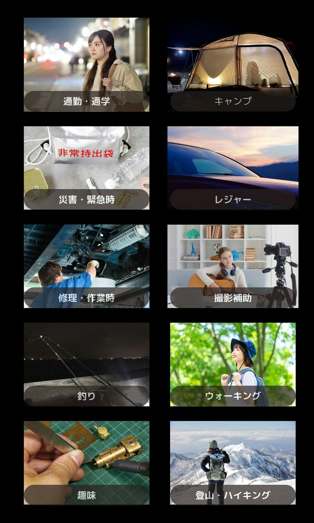 A キャンプ、夜釣り、ハイキング、車中泊、停電時、車の修理、緊急時の救助など、さまざまなシーンで活躍します。