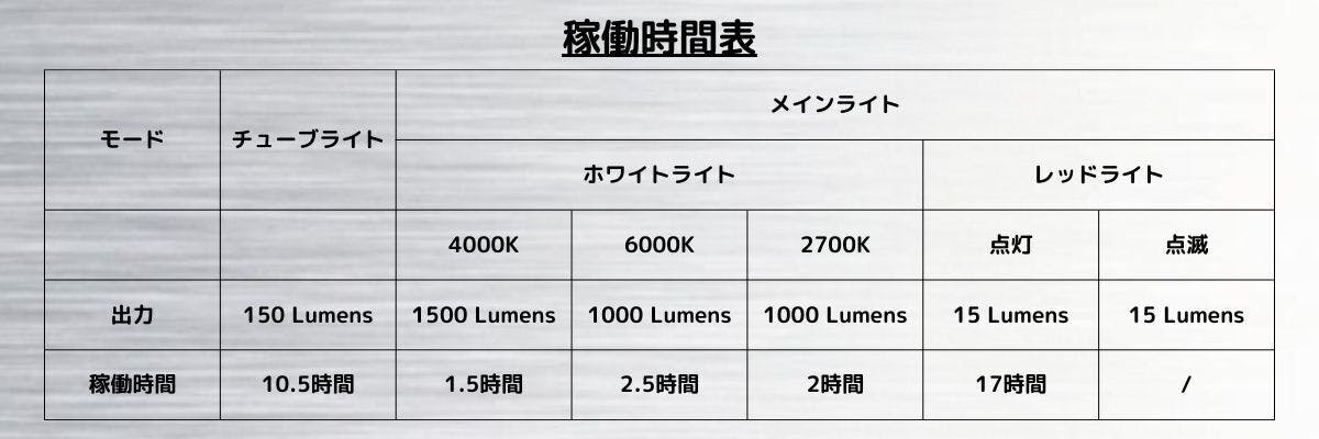 点灯モードの稼働時間は、10時間以上と長持ちで安心です