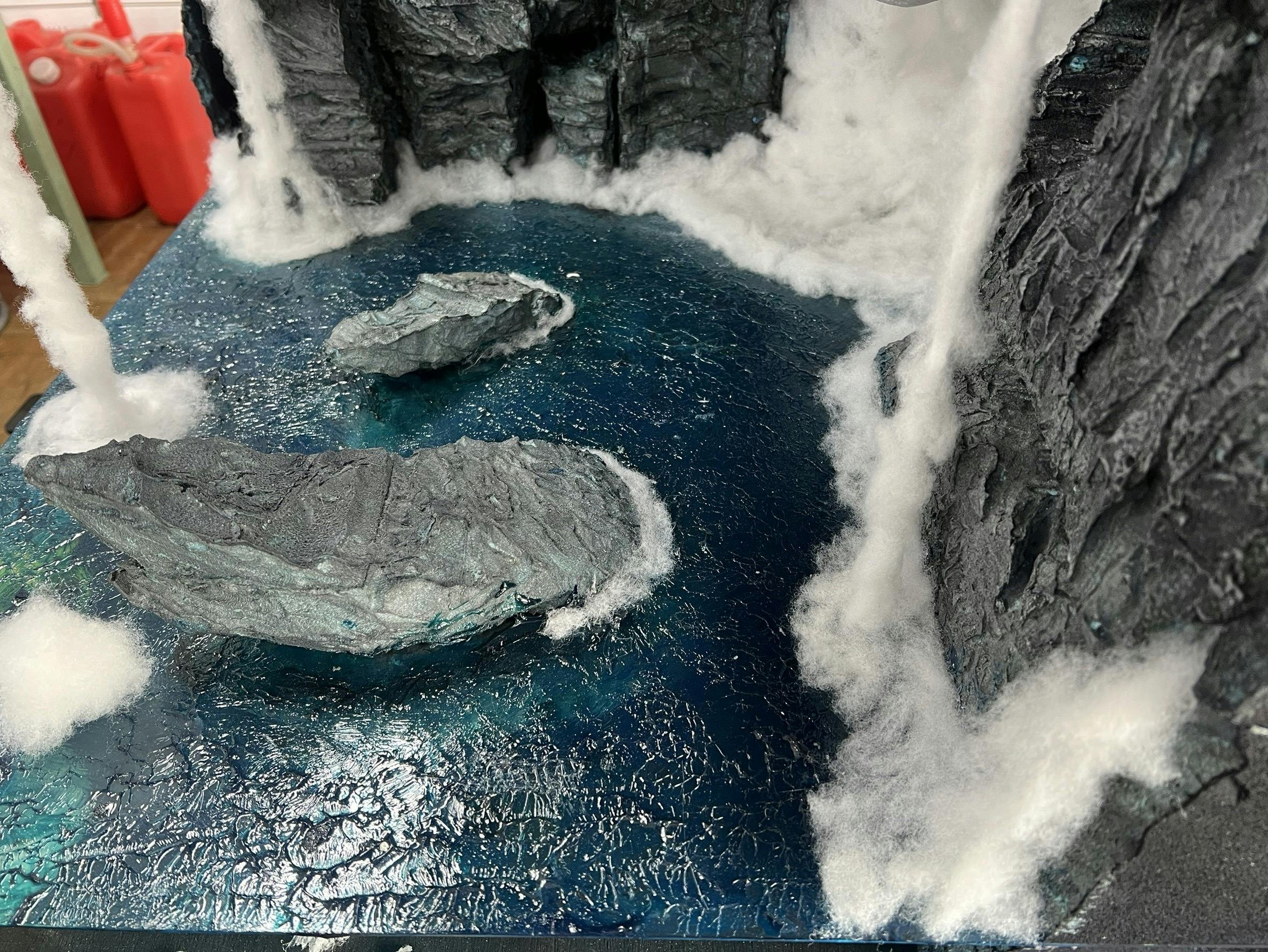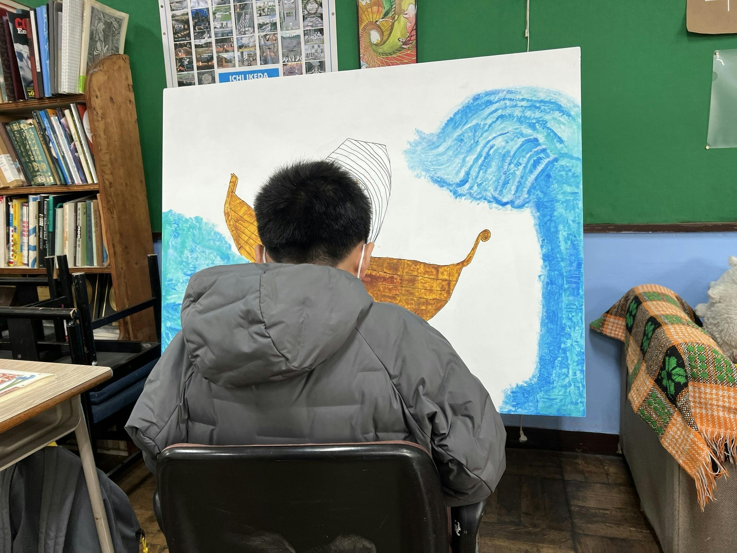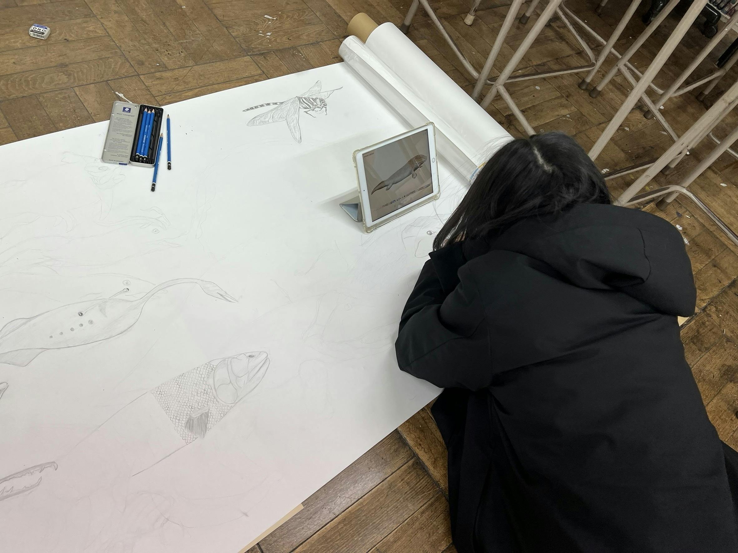 寝っころがって描くほど、大きな画面。さあ、どんな作品が出来るのか!