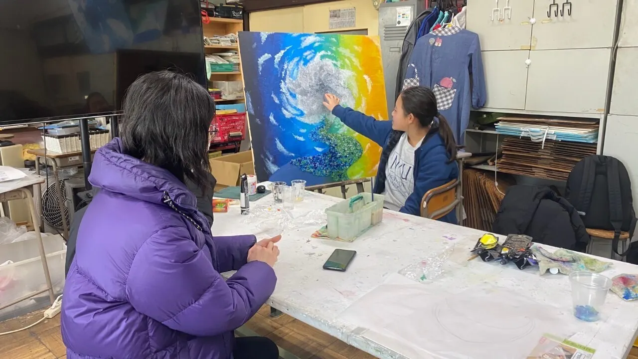 応じてくださったのは、高校2年生の朴タソムさん。なぜ美術部に入ったのかという個人的なお話から、今回のテーマ「流転」について、美術部の年間活動の流れなど、展示に向けて追い込み中の忙しいなか、私たちの素朴な質問・疑問に丁寧に答えてくださいました。知的でクールな次期部長タソムさんの、創作に対する思いを語ったインタビュー、ぜひ聴いてみてください!