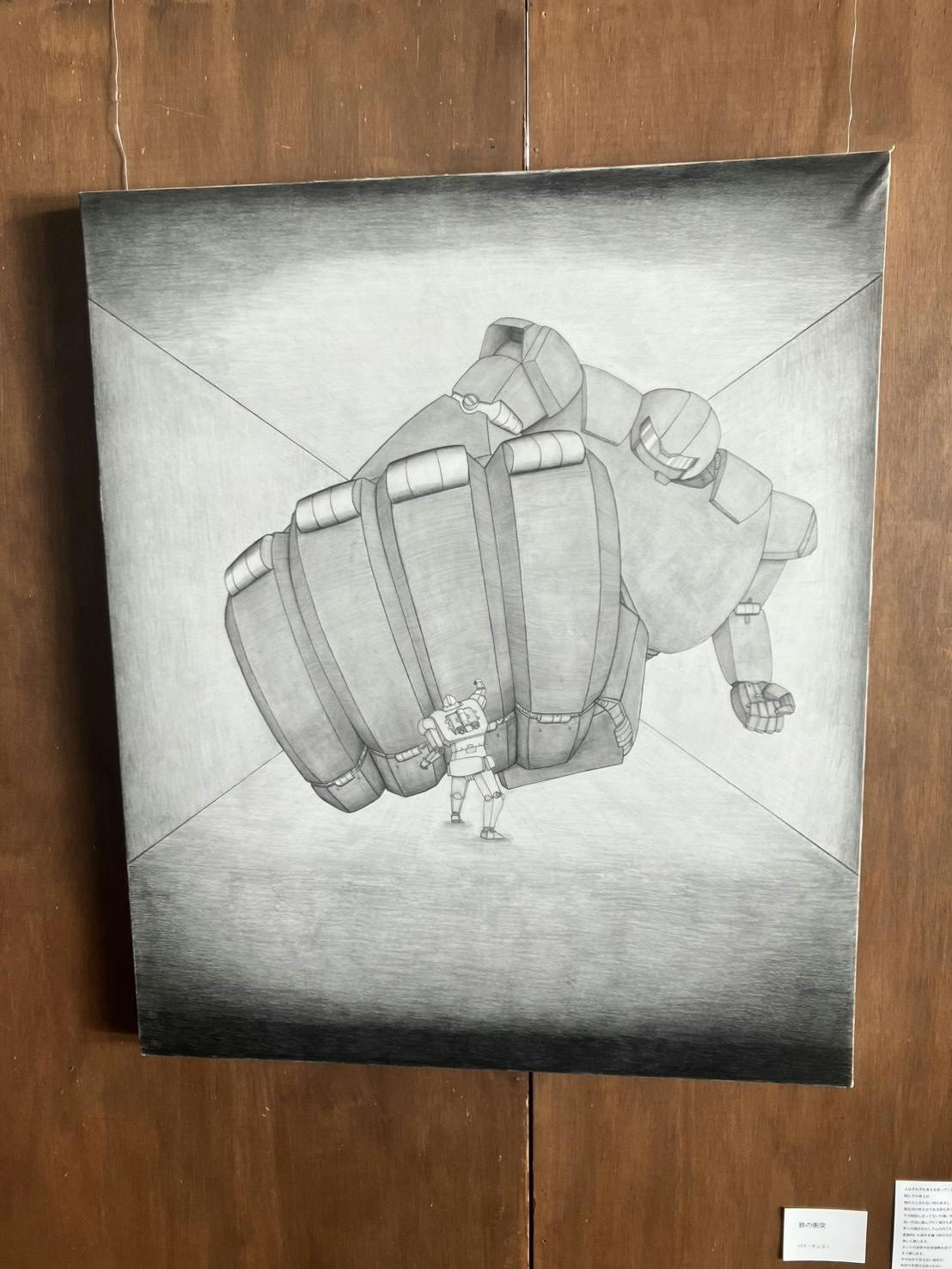 ロボットらしきものの下でうごめいている何かがロボットを崇めているのか、取り囲み何かを訴えているのか、考えさせてくれます。