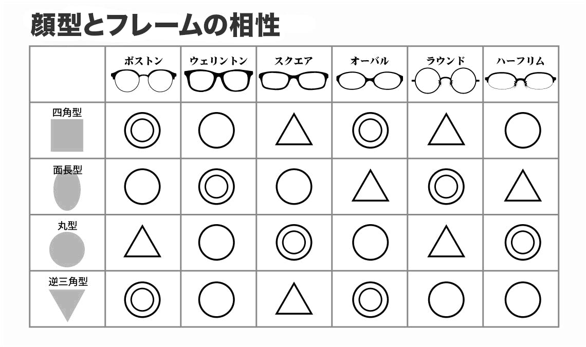 ボストンは逆三角形顔とも相性がいいです。角のとれた丸みがあるフレームが、逆三角形顔のシャープな印象をやわらげてくれます。また、顔型と同じ逆三角形なので顔になじみやすいのも特徴です。