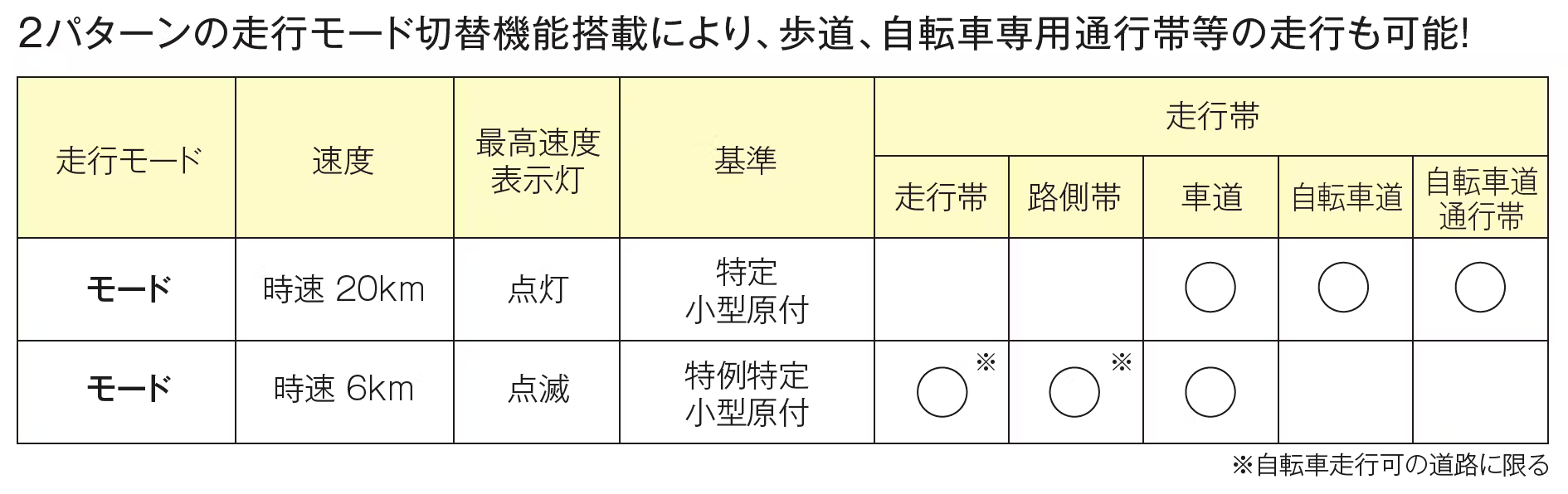 本製品は公道および歩道の走行を可能とする「特例特定小型原動機付自転車」の保安基準に適合する保安部品を標準装備しています。ナンバー登録と自賠責保険への加入を行うことで公道走行が可能です。走行場所や走行時のルール等については下記6.をご覧ください。