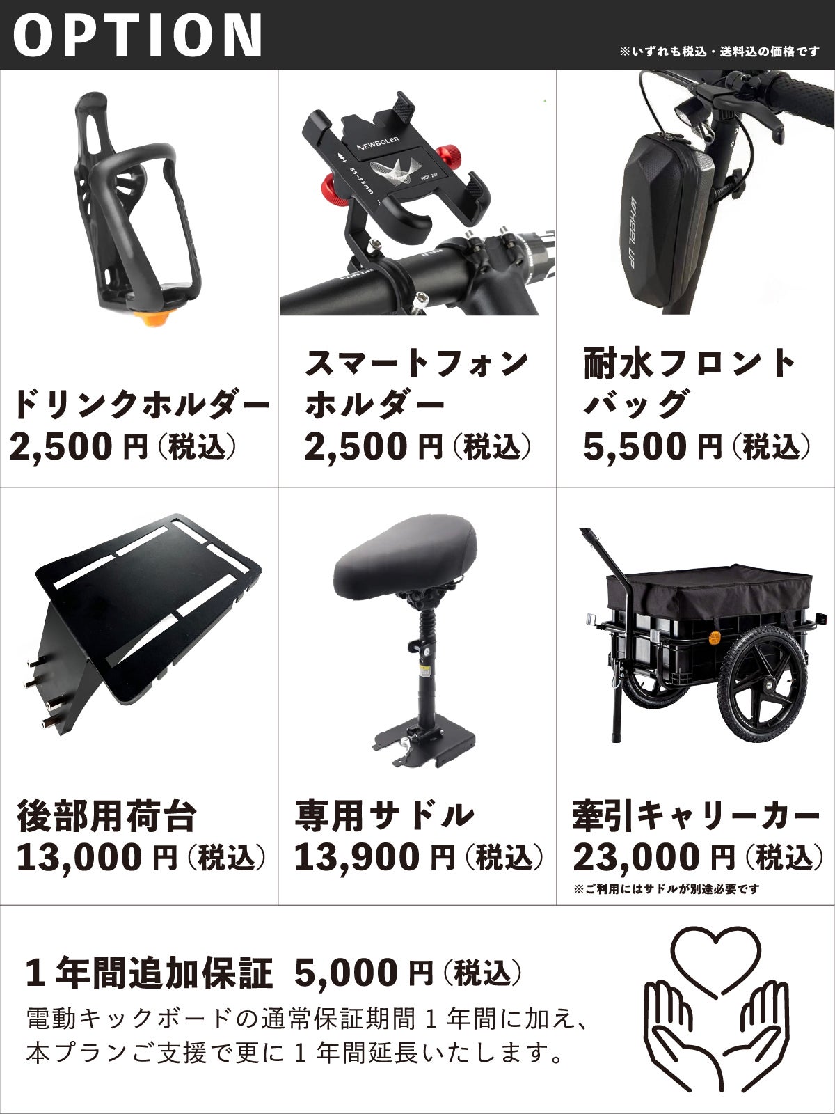 ※メンテナンスセンターへの送料とお客様の元へお届けする際の送料は別途お客様負担となります。※バッテリ、ブレーキパッド、タイヤについては消耗品のため無償保証の対象外です。※タイヤ摩耗、バッテリ容量低下は保証期間内であっても有償での対応となります。