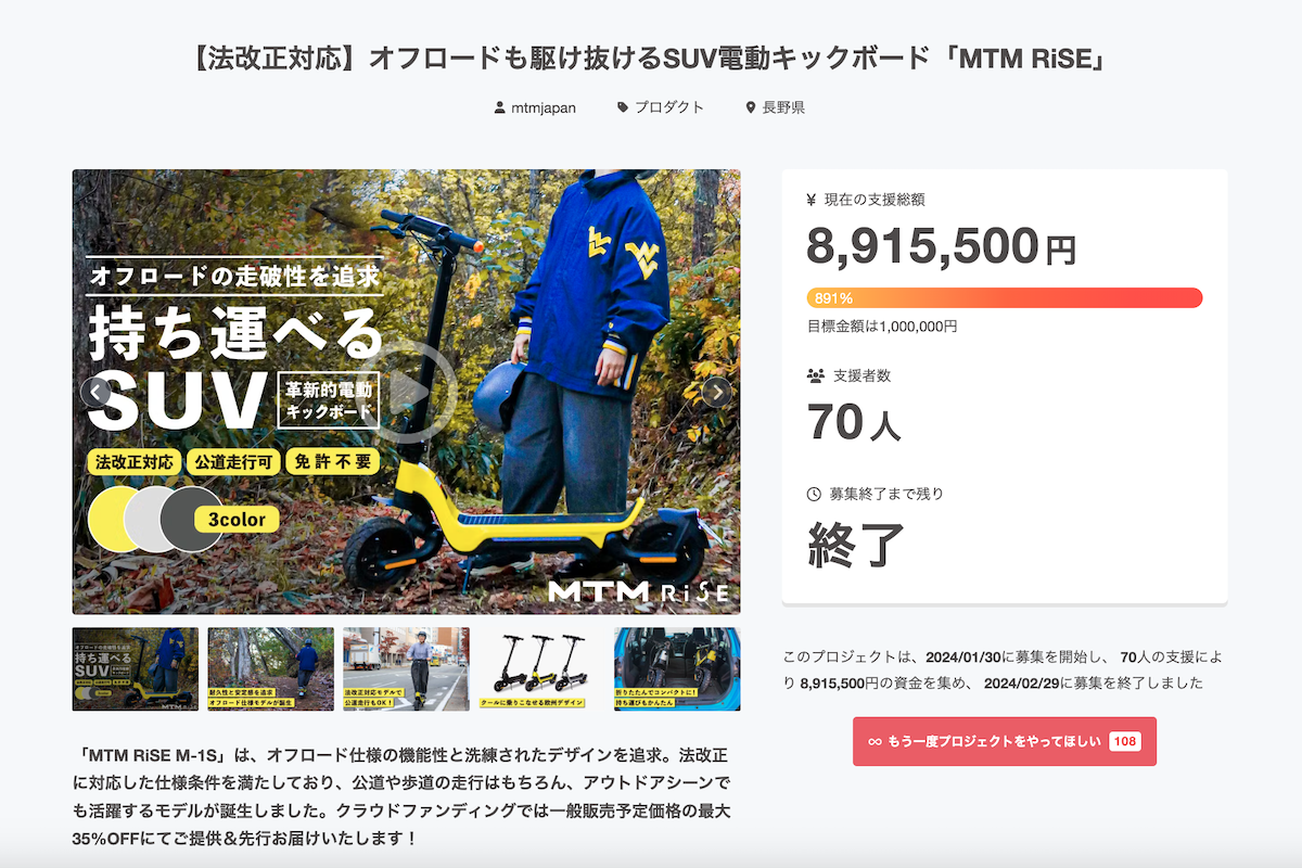 CAMPFIREで実施された電動キックボード関連のプロジェクトでは最高調達額を記録(2025年2月現在)