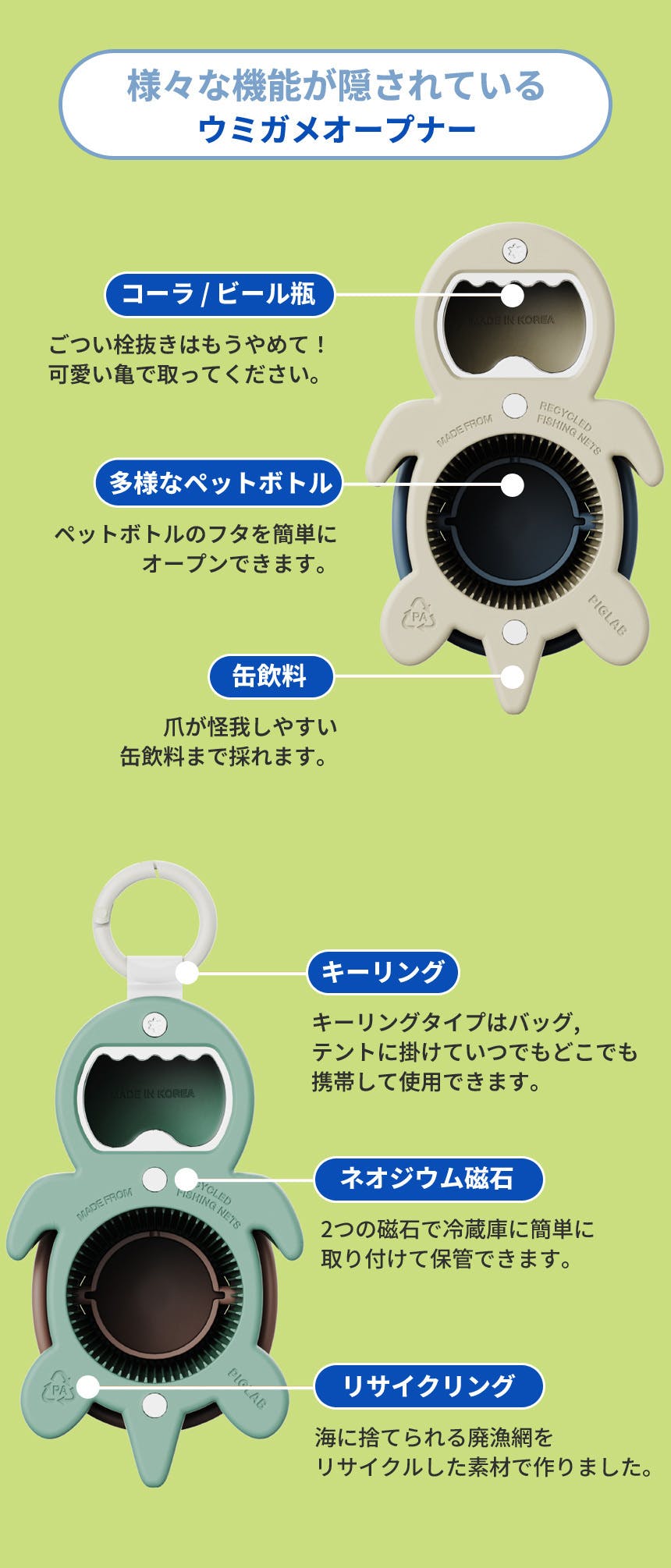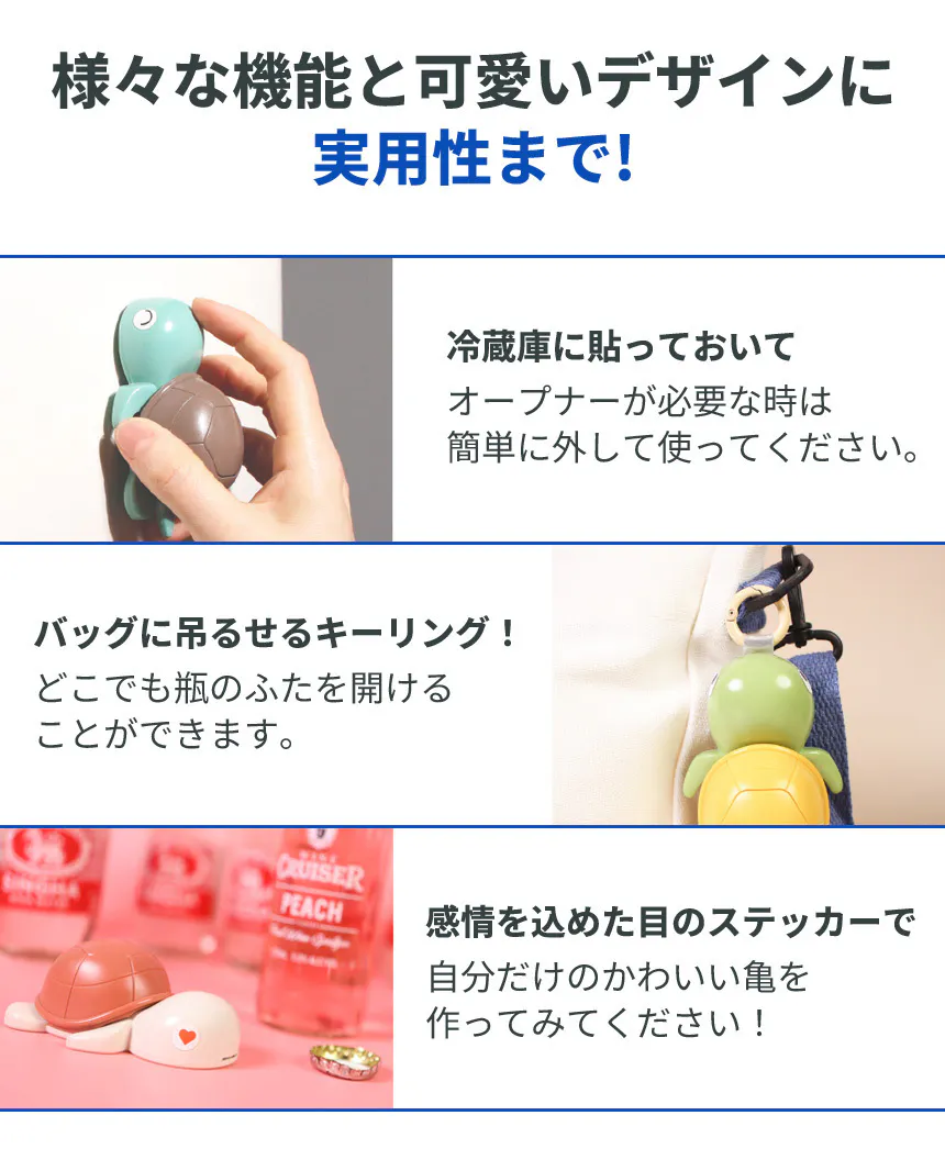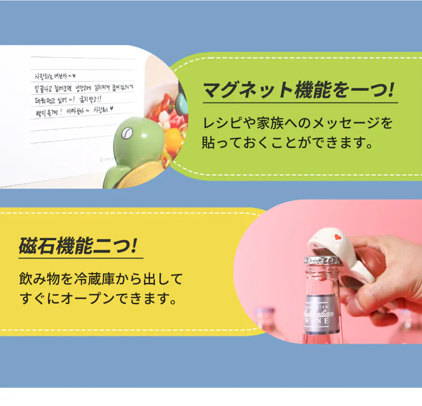 また、カメの尻尾の部分は爪が長かったり弱い女性が簡単に取れるように缶切り機能を適用した3in1製品で、下段にはネオジウム磁石を適用して冷蔵庫に貼っておき必要時にすぐ取って使える長所があります。
