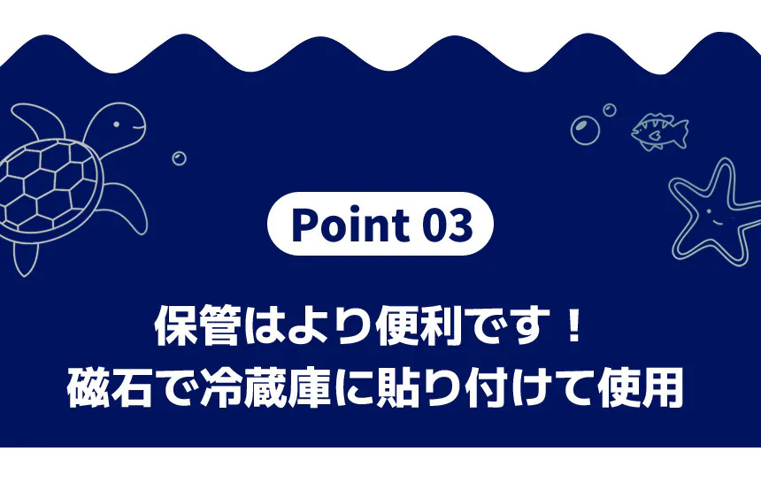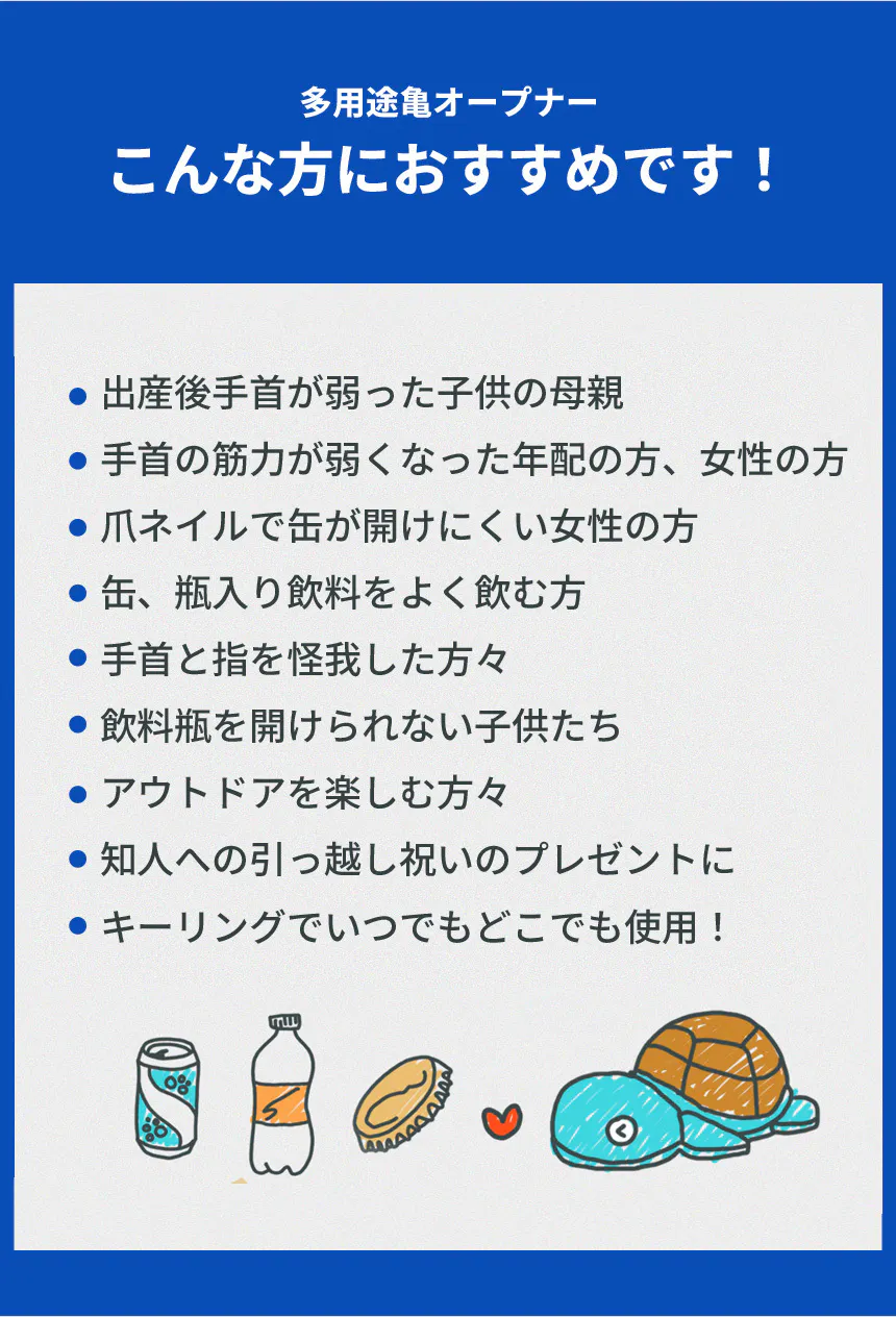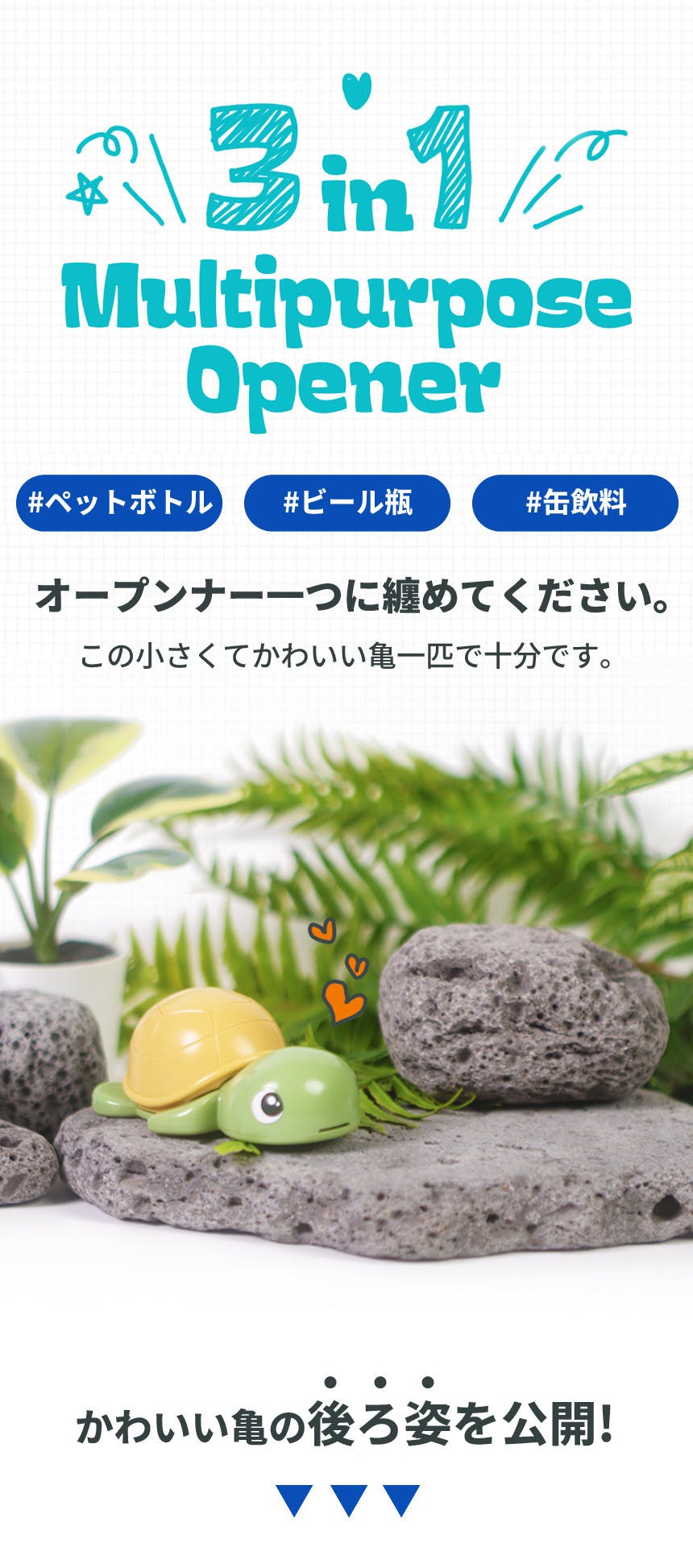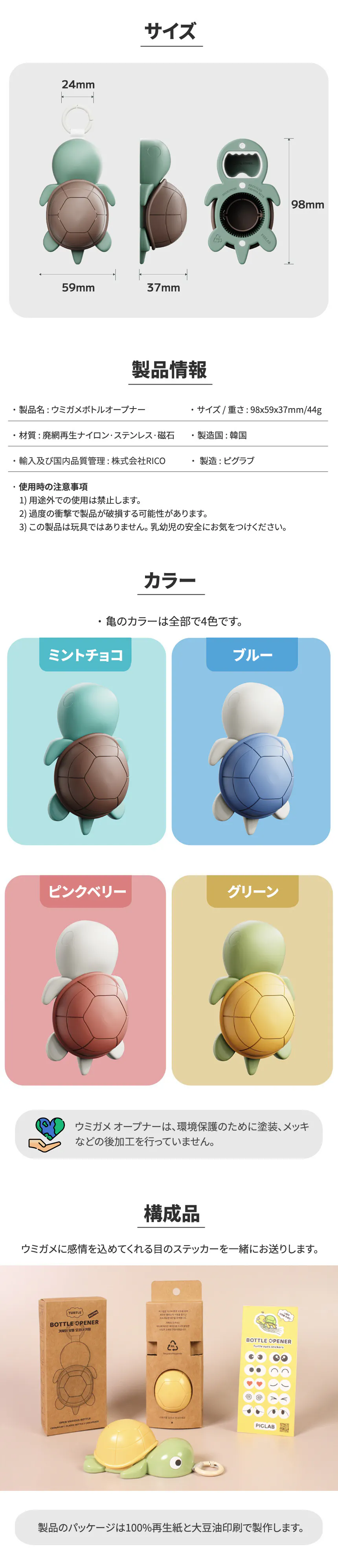 また、カメの尻尾の部分は爪が長かったり弱い女性が簡単に取れるように缶切り機能を適用した3in1製品で、下段にはネオジウム磁石を適用して冷蔵庫に貼っておき必要時にすぐ取って使える長所があります。