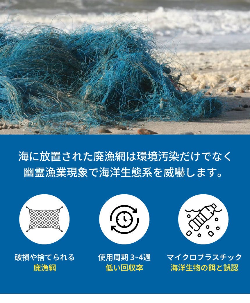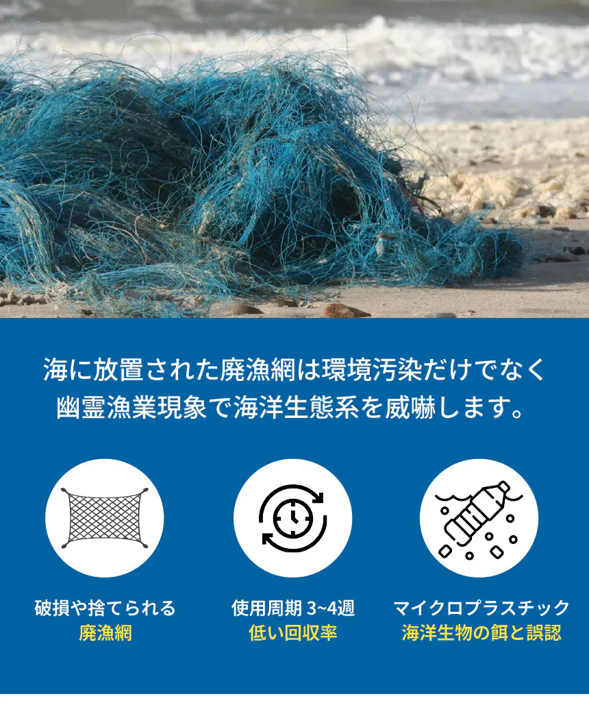 廃漁網は海中に沈んで海洋生物を締め付け、細かく分解されても微細プラスチックが海洋生物に流入し海洋汚染を加速化させる現象が現れています。