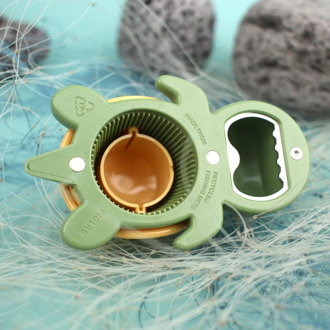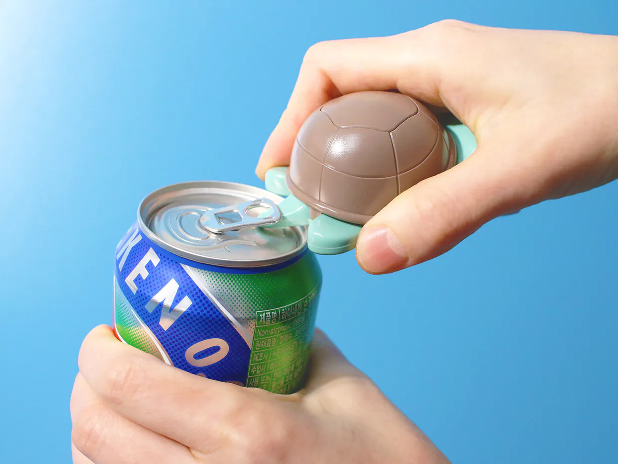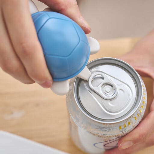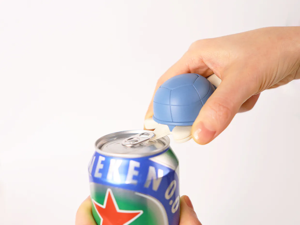亀の背中を掴んで尻尾を缶オープナーの間に挟んで持ち上げると、缶を簡単に取ることができます。