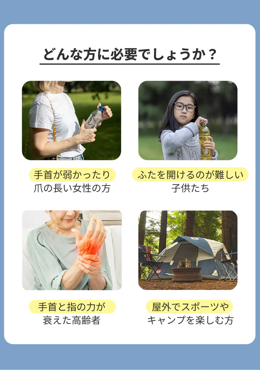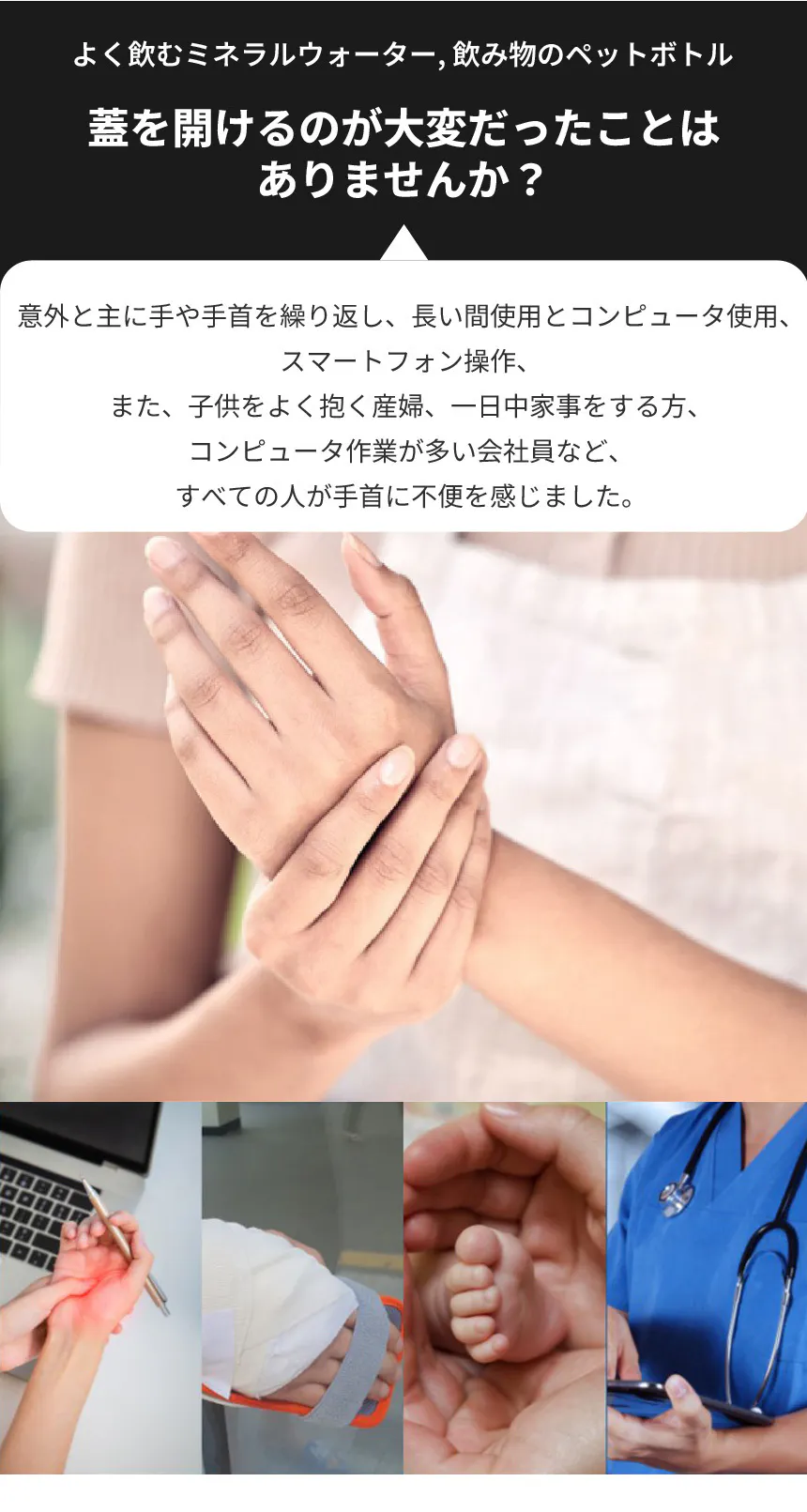 手首が弱い老弱者と子供たち、ドゥーヒ出産後に手首が弱くなった子供の母親がペットボトルを開けられない姿を見てペットボトルオープナーの必要性を感じて製作するようになりました。