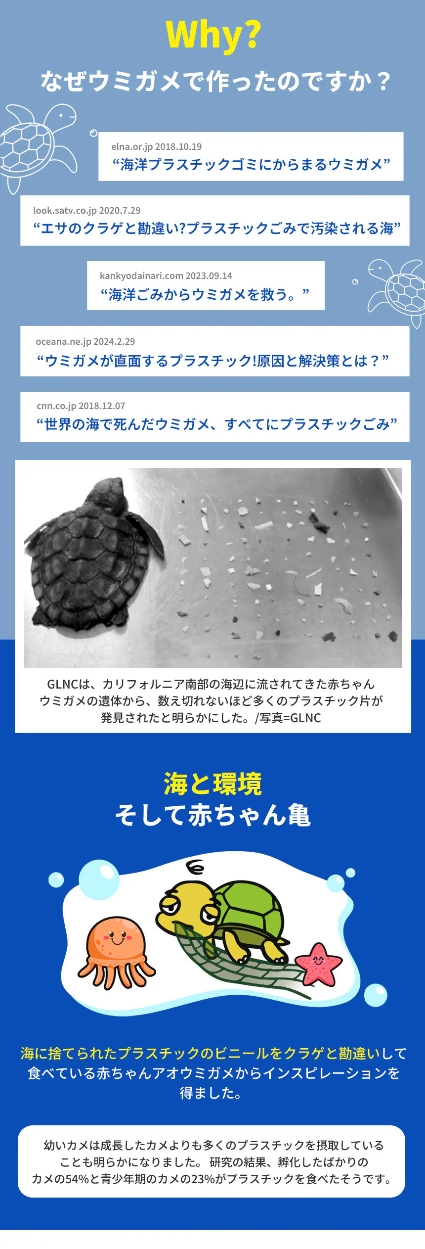 今回の製品は、海に捨てられる廃漁網を回収してリサイクルしたナイロン素材を使用し、海の中でプラスチックビニールをくわえている青いウミガメにインスピレーションを言語企画することになりました。