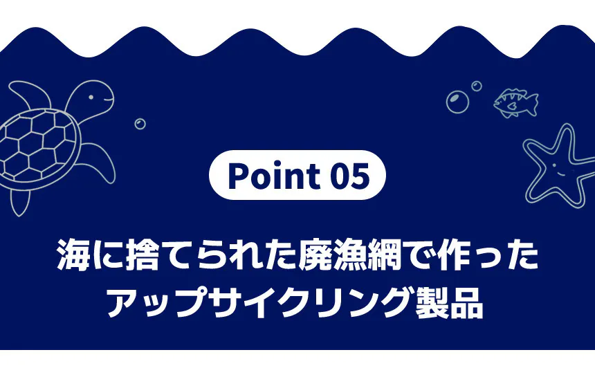 すべての原料はアップサイクリングに活用された廃漁網素材は、バダン捨てられる網を再割用されたナイロン素材であり、rohs認証を受けた安全な素材が使用されています。