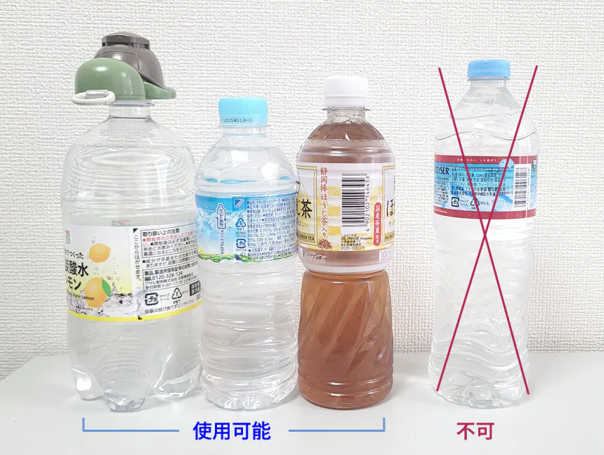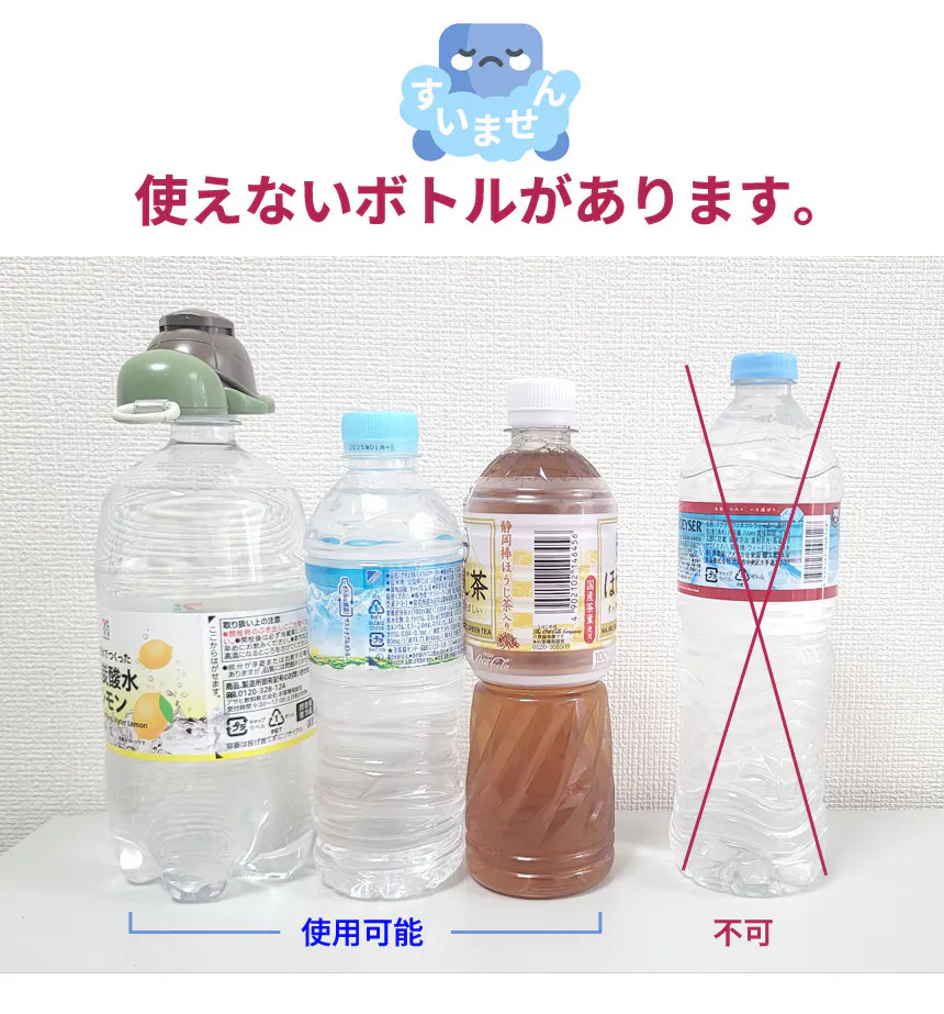 ペットボトルのふたは一般的に規格化されていますが、ブランドごとに若干2mm程度差があります。 ただし、海外ブランドのスポーツドリンクやミネラルウォーターのフタが小さかったり、大きい製品があります。 このような製品は使用できません。