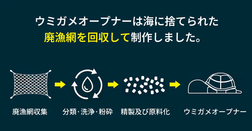 今回製作してご紹介する多用途ウミガメオープナーは、以前ご紹介した廃木材を再利用したカタツムリカッターのように廃漁網をリサイクルした製品です。
