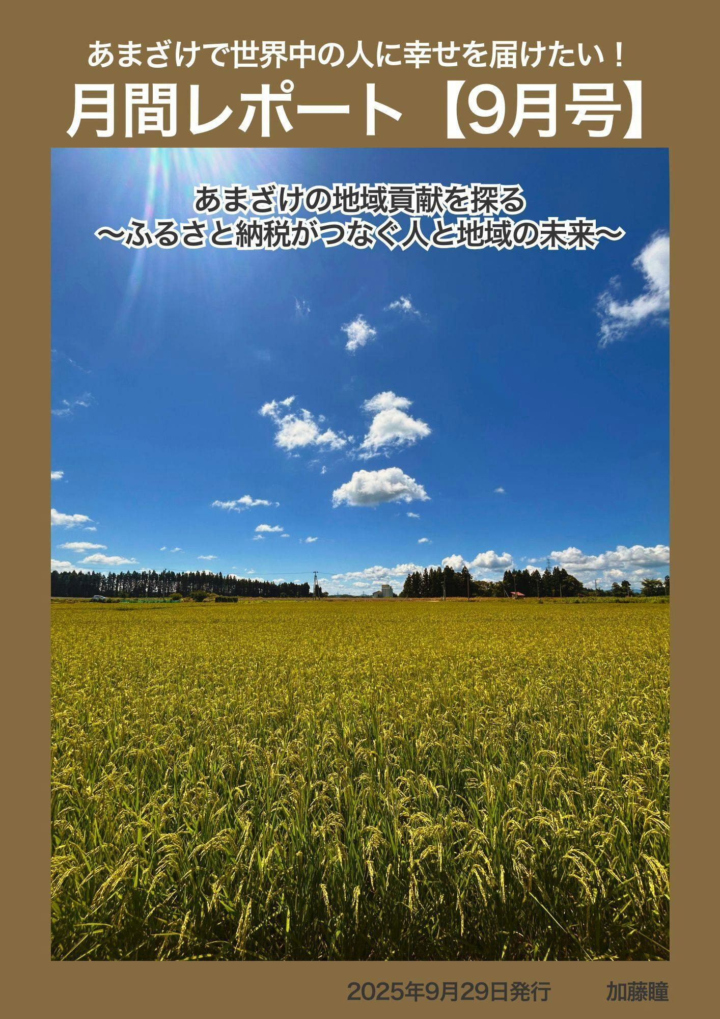 2025/09/29 21:55こんばんは!夜分遅くに失礼します。加藤瞳です。いつもあたたかいご支援をいただき、ありがとうございます。9月も残りあと1日ですね。みなさま、いかがお過ごしでしょうか。秋田では朝晩の空気がひんやりしてきて、掛布団なしでは寒くて目が覚めてしまうくらいです。田んぼもすっかり秋の装いで、緑から黄金色へと変わり、稲刈りを終えた田んぼを飛行機の窓から眺めた時の景色は、なんとも言えない美しさでした。今回のレポートのなかにその時の写真を載せていますので、どれが飛行機からの景色か、よければ探してみてください!さて、本日、リターン対象となるあまざけアンバサダーのみなさまへ、『月間レポート(9月号)』をお届けいたします。今月のレポートでは、あまざけの地域貢献を探求した内容をまとめています。レポートが届くのを、どうぞ楽しみにお待ちください!季節の変わり目、どうぞあまざけで元気をチャージしながら、健やかにお過ごしください! もっと見る