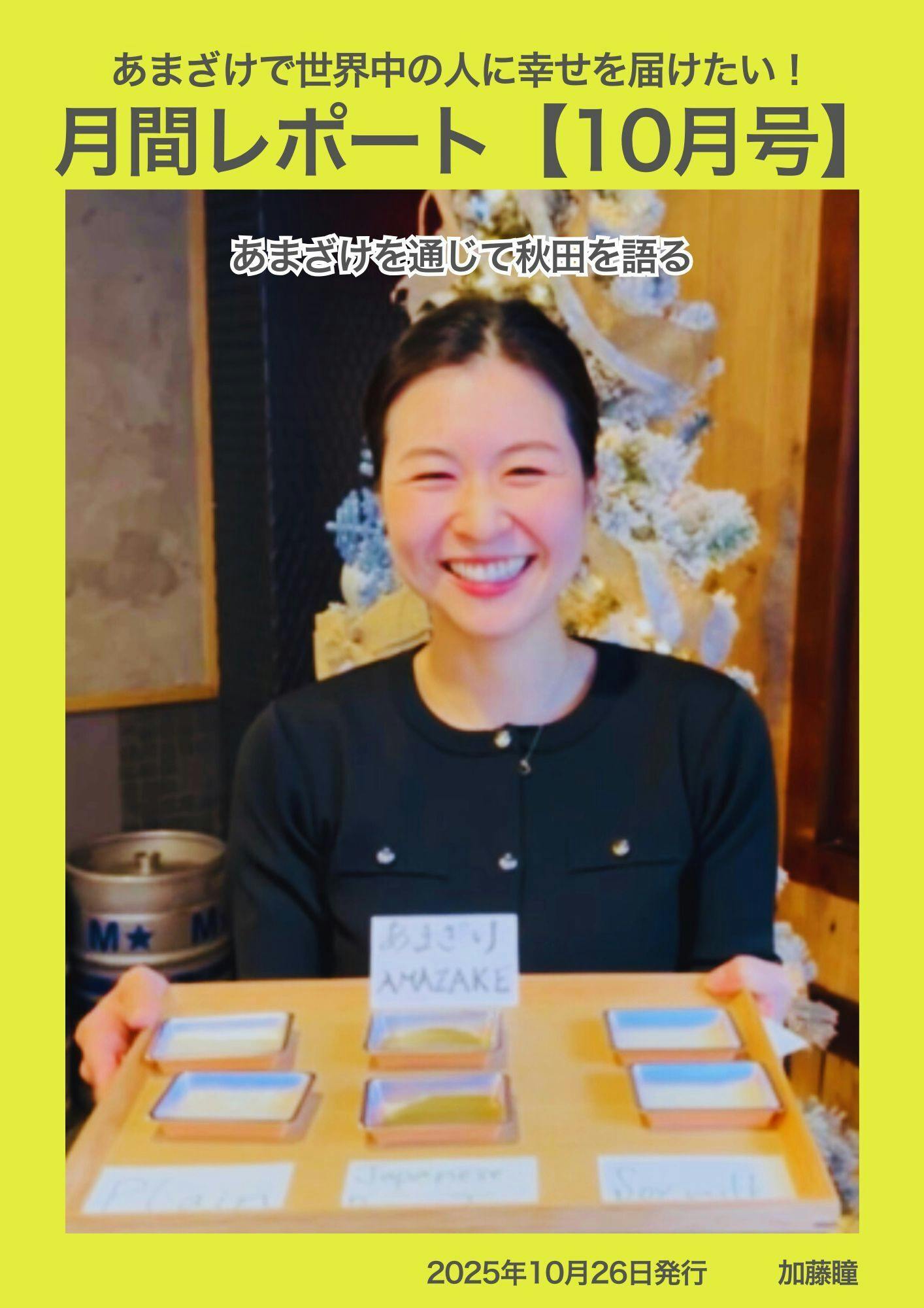 2025/10/26 18:13こんばんは!加藤瞳です。いつもあたたかく見守ってくださり、本当にありがとうございます。10月もあっという間に過ぎ、秋の空気がぐっと深まってきましたね。銀杏の木々が黄色く色づき、道を歩くだけで季節の移ろいを感じます。さて、本日は、あまざけアンバサダーのみなさまへ『月間レポート(10月号)』をお届けいたします。今月のテーマは「あまざけを通じて秋田を語る」です。講演という形で、あまざけを通じて秋田の魅力を発信することの可能性を考えてみました。講演内容を具体的に整理していくうちに、「こう伝えたらもっと楽しんでもらえそう」と想像が広がり、ワクワクが止まりませんでした。まとめ終えた頃には、「いつか本当にやってみたい!」という思いがふくらみ、秋田の魅力と可能性を語ることが、私にとって本当に大切で、心から好きなことだと改めて感じました。紅葉がきれいなこの季節、ぜひあまざけを片手に、ゆったりとお読みいただけたら嬉しいです。朝晩の冷え込みも強まってきましたので、どうぞお体を大切にお過ごしください。 もっと見る