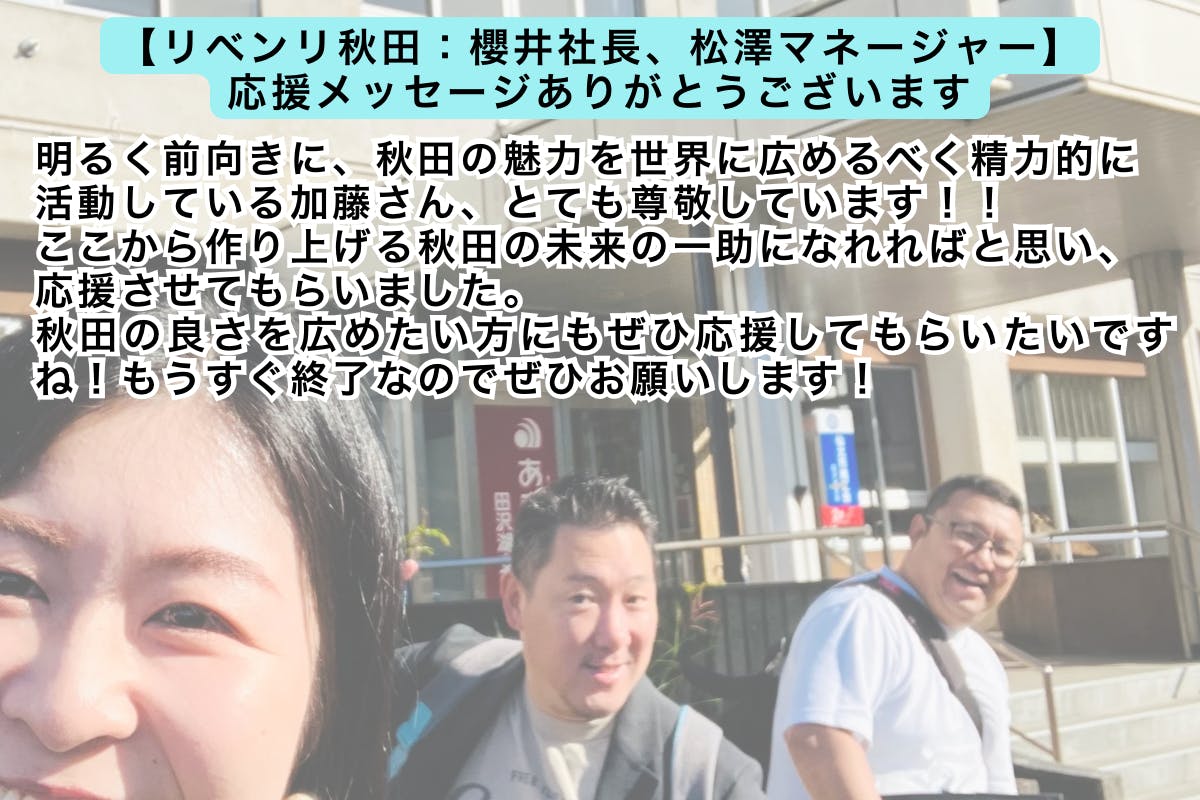 本日は、応援コメントいただきましたのでご紹介いたします。「リベンリ秋田」の櫻井社長、松澤マネージャーより素敵なメッセージをいただきました。実は3年ほど前からのご縁があり、私が秋田にどう貢献できるのかを試行錯誤している時期に相談に乗ってくださいました。秋田でのボランティアのきっかけをくれたのも、おふたりです!