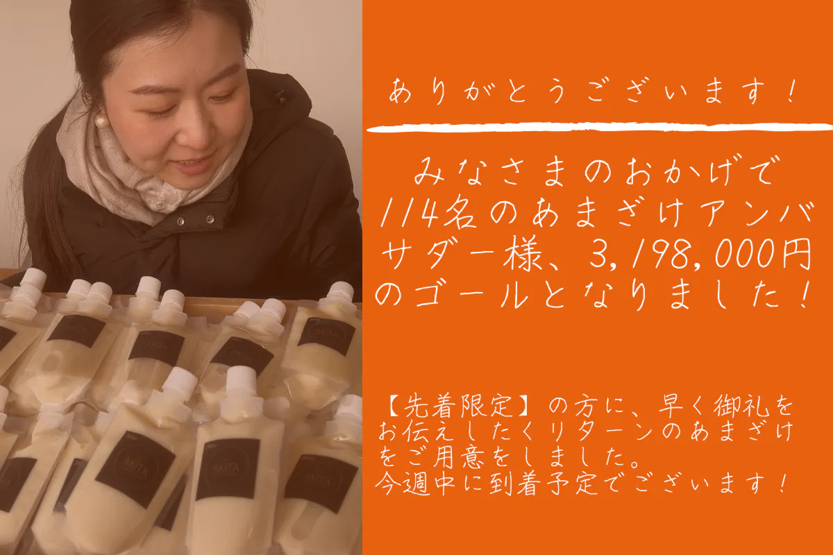 みなさまの応援、拡散、メッセージ本当にありがとうございます!おかげさまで「あまざけアンバサダー114名様」、3,198,000円でゴールとなりました。