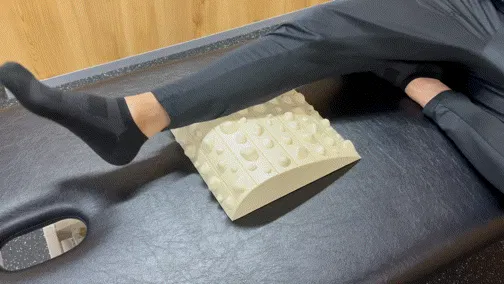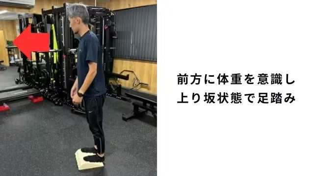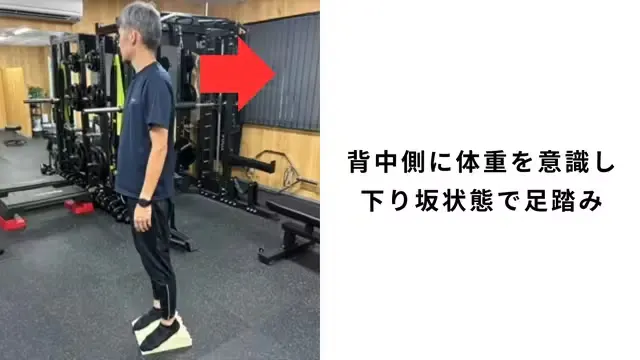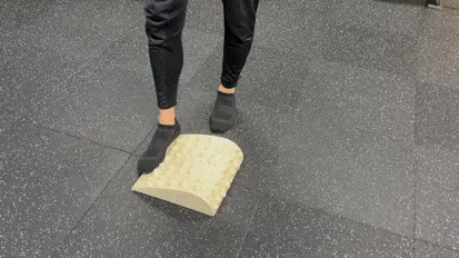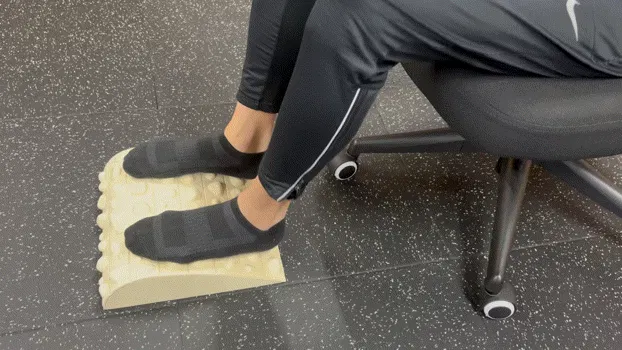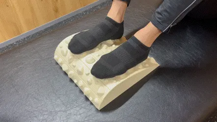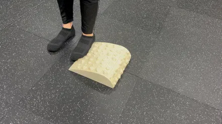 不規則な突起を踏みつけ、足裏に毎回違う刺激を入れてあげます。過度に肩や首に力が入らないように適度に脱力して腕を振りながら足踏みします。踏み終わった後に、足裏全体が地面にピッタリくっついている感覚、重心位置などを意識します。