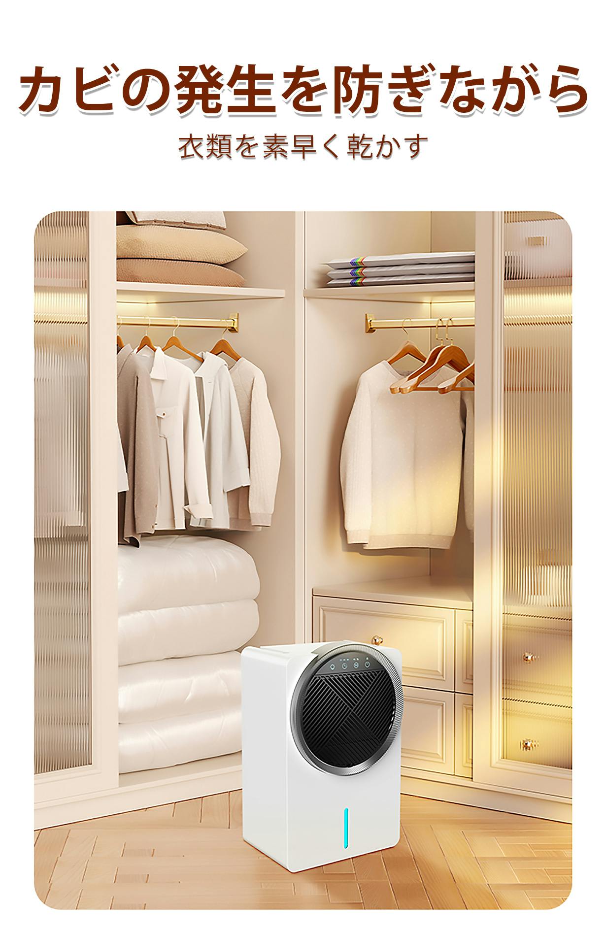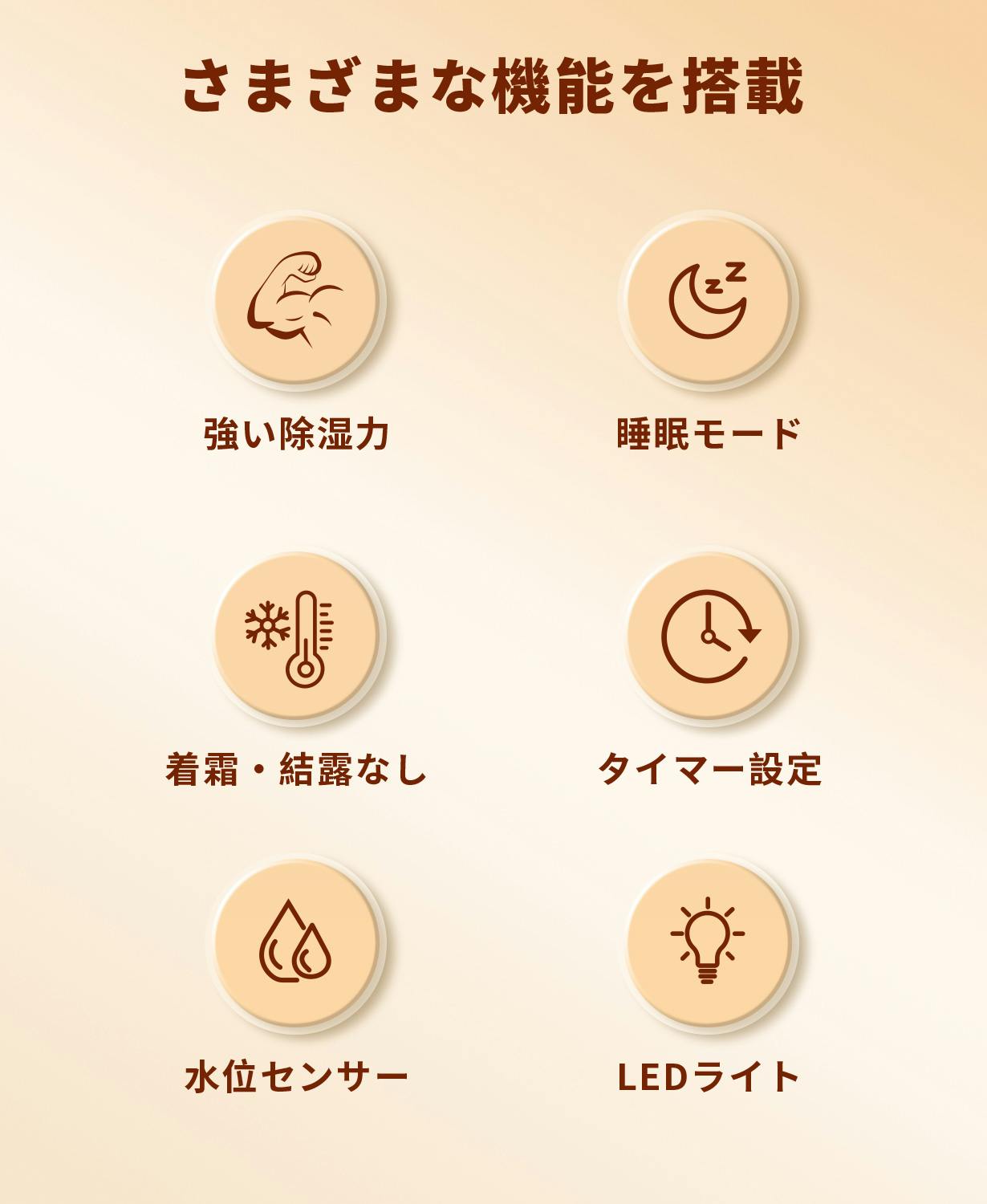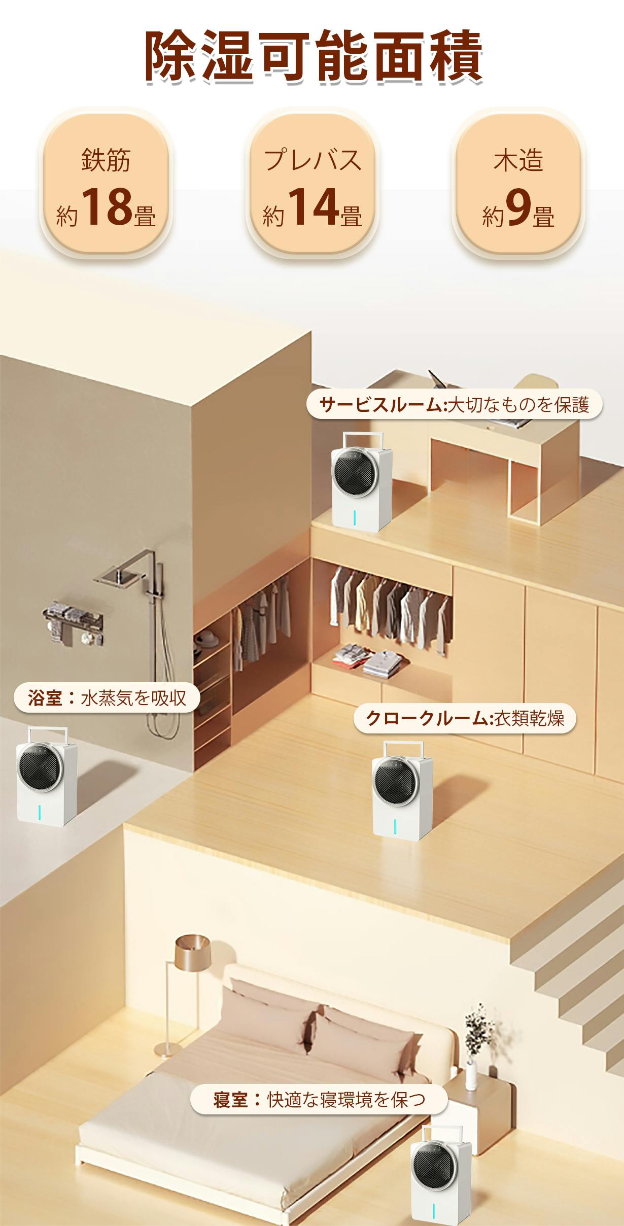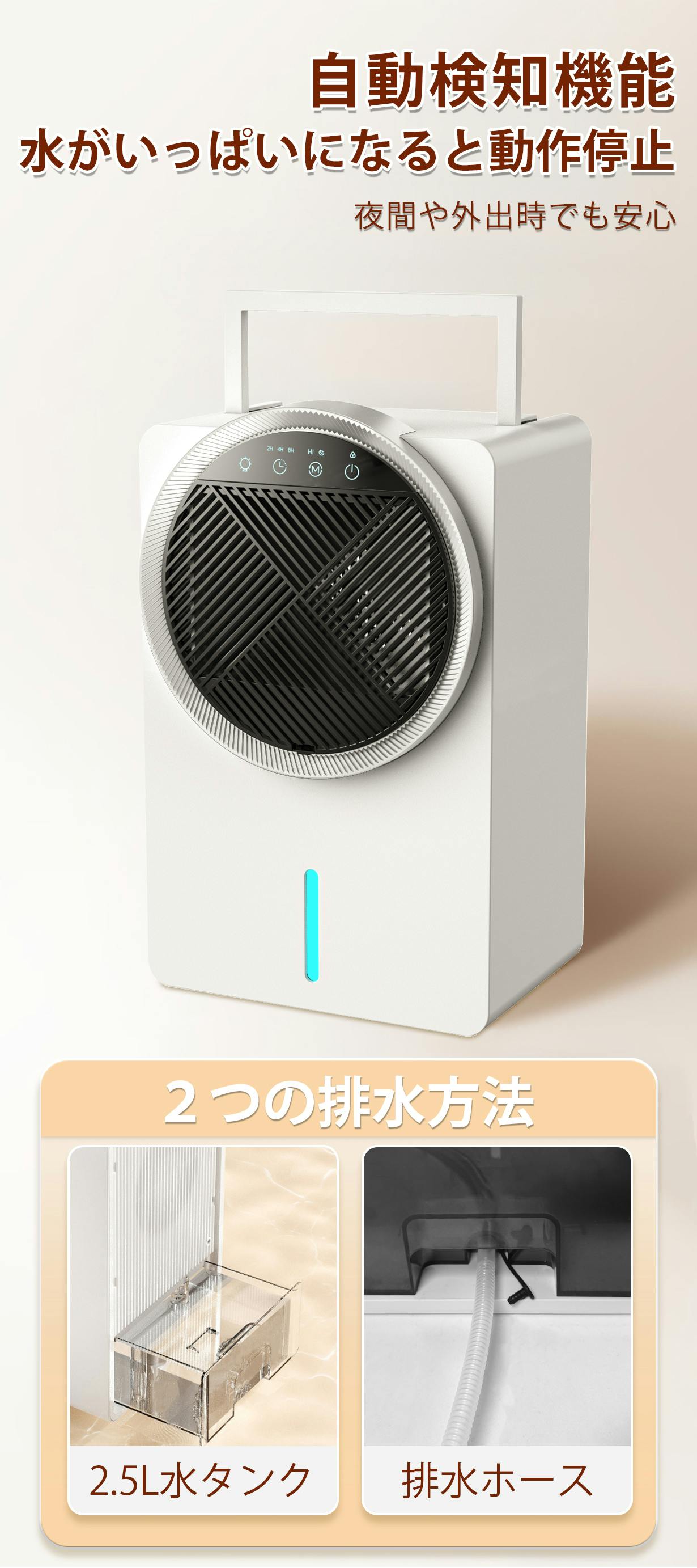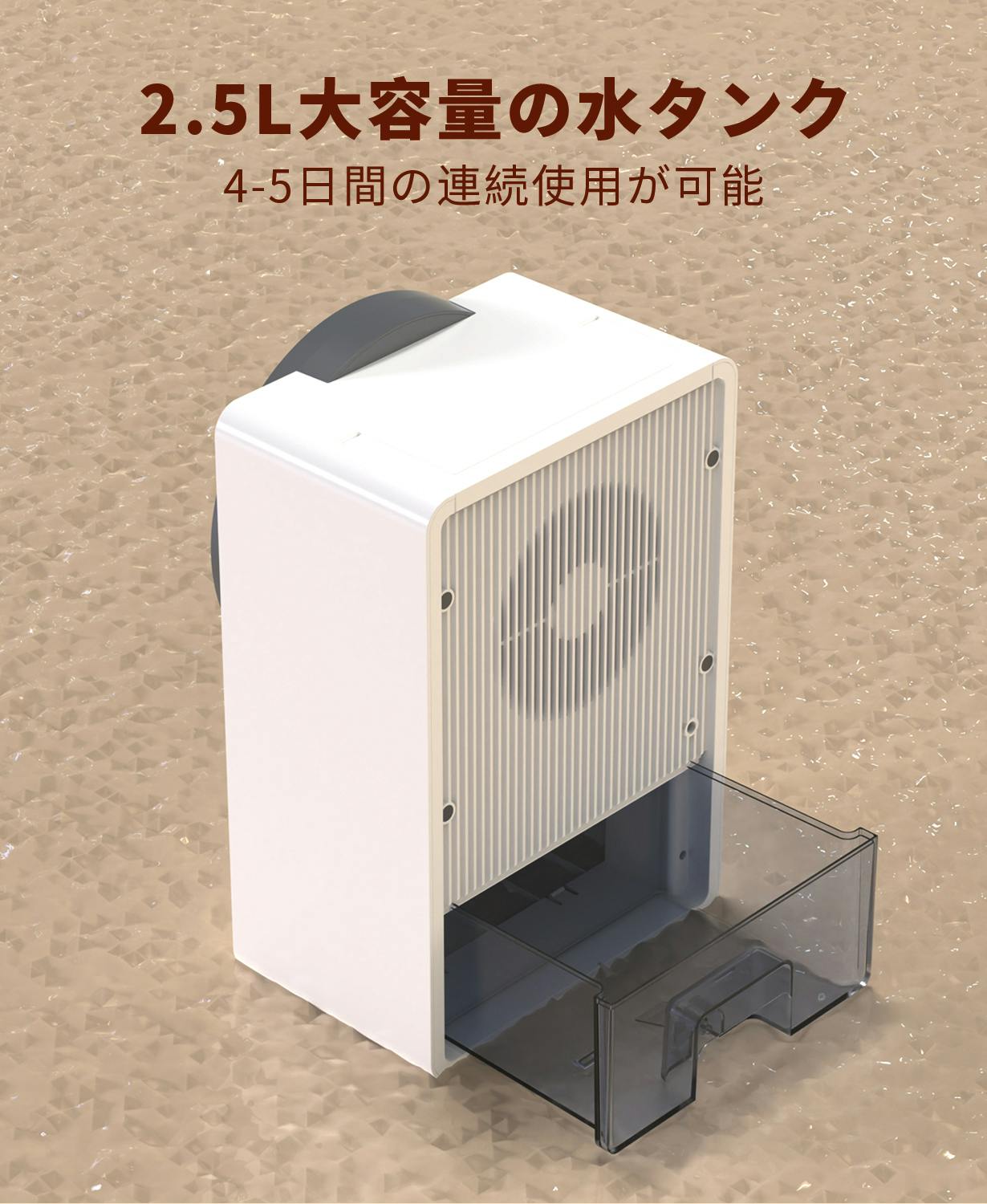 コンパクトなのに、2.5L大容量の水タンクを内蔵しています!この水タンクにより、水捨ての手間が軽減し、高湿度の環境でも4-5日間の連続使用が可能です。(ご注意:連続使用可能な日数は、除湿量によって異なります。)