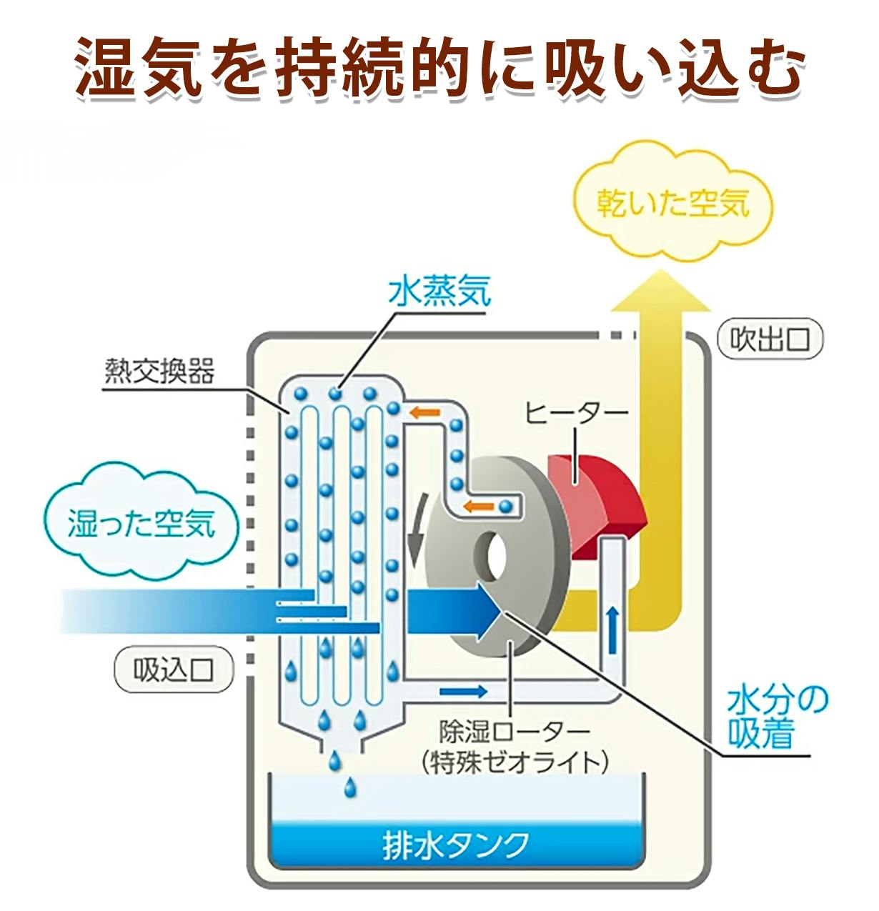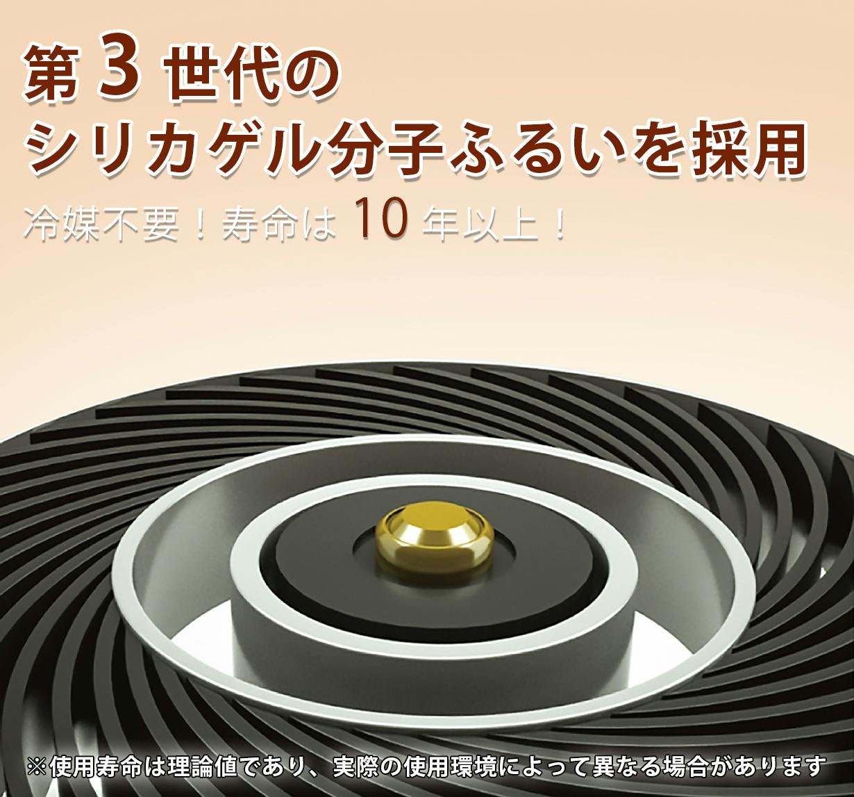 デシカント式除湿機は、コンプレッサー式やペルチェ式除湿機と異なり、冷却で湿気を取り除くことではなく、分子ふるいを使って空気中の水分を吸収する方式を採用しています。それにより、冬で気温に左右されることなく、低温環境でも高い除湿性能を発揮し、着霜や結露がなくて効率的に除湿します。