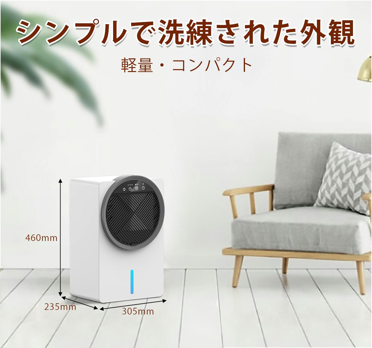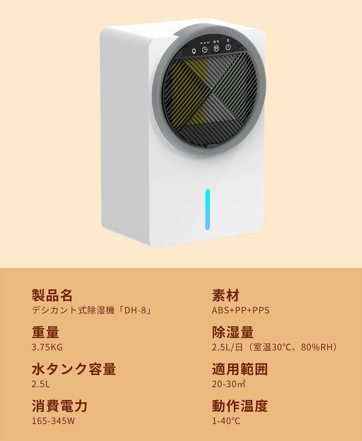 除湿機「DH-8」は、シンプルで洗練された外観が特徴で、3.75kgの重さとコンパクトなデザインにより、どこに持ち運んでも便利し、限られたスペースにも簡単に設置できます。また、軽量でありながら1日あたり最大2.5Lの除湿力を備え、広い空間でも効果的に除湿できます。