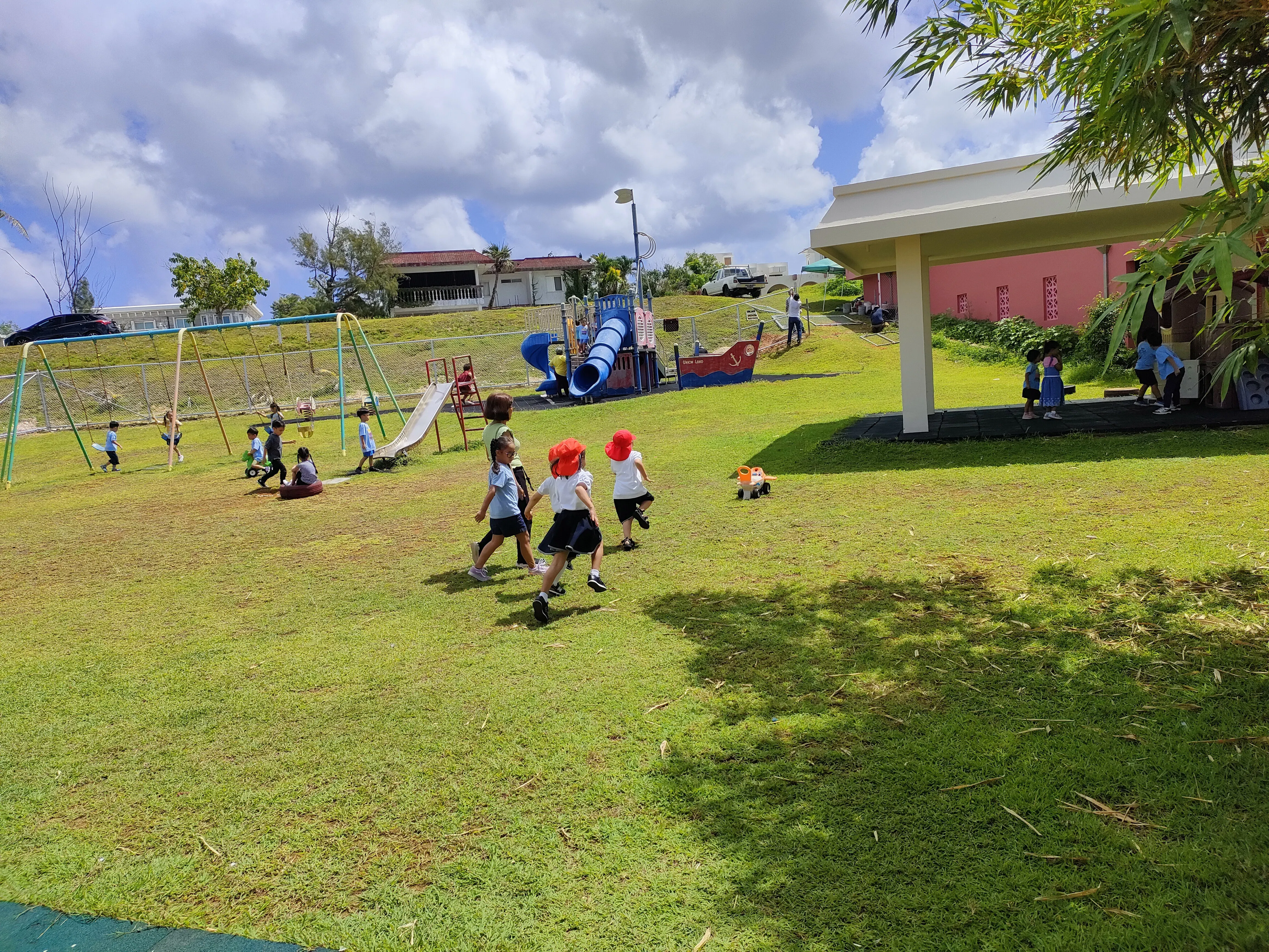 広い園庭で遊んだり勉強したりする中で