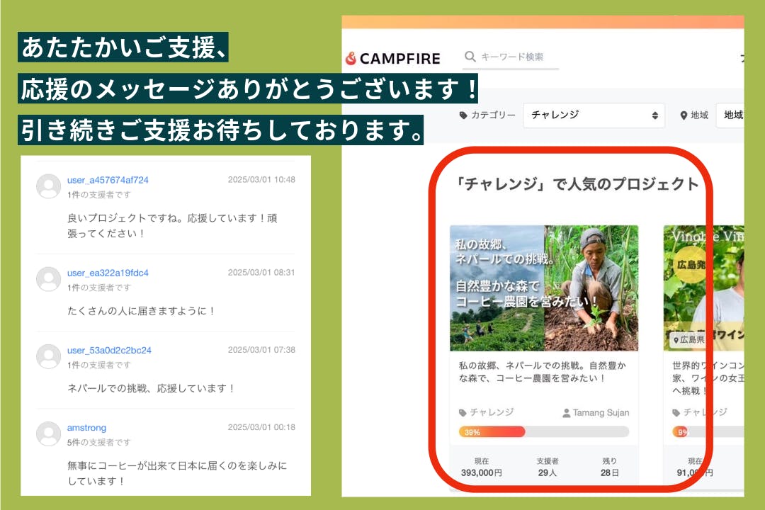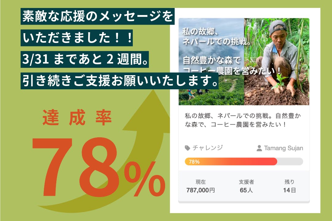 2025/03/04 22:42みなさま3/1のスタートから4日目にもかかわらず、多くのご支援をいただきありがとうございます! 4日目にして目標の40%の支援額をいただくことができました。ご支援いただいた方々、また情報を拡散していただいた方々へ、心よりお礼申し上げます。日頃よりお世話になっている方々から、ありがたいことに、このプロジェクトに対する応援メッセージをいただきました。こちらでご紹介させていただきます。 【よつばジェラート様より】遠くネパールの地でコーヒー農園を立ち上げ、雇用創出と環境問題に取り組まれていることに心から尊敬します。美味しいコーヒーが生まれる背景には、たくさんの努力と情熱があるのだと改めて感じました。人の暮らしと自然が共に豊かになる未来を目指して、一歩一歩進んでいくその姿に、多くの方が勇気をもらうはずです。私もその想いに共感し、応援させていただきます!どうか最後まで走り抜けてください。ネパールコーヒーが、日本や世界の人々を笑顔にする日を楽しみにしています。クラウドファンディング締め切りは3月末までです。引き続き応援いただけますと幸いです!何卒宜しくお願い致します。タマング・スーザン もっと見る