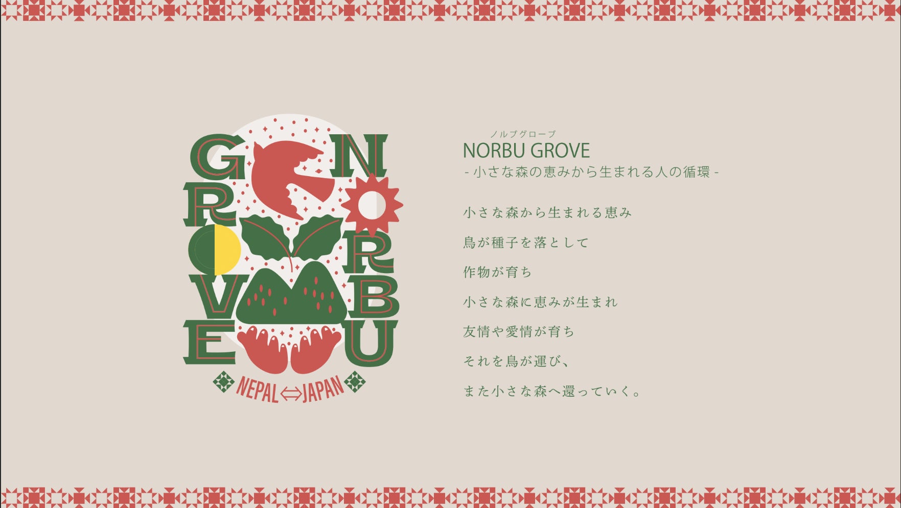 GROVEのOは月を表し、NORBUのOは太陽を、背景の円は地球を表しています。小さな森から生まれるの恵み、鳥が種子を落として作物が育ち、小さな森に恵みが生まれ、友情や愛情が育ち、それを鳥が運び、また小さな森へ還っていく。そのような循環が生まれる農園となるよう、努めてまいります。