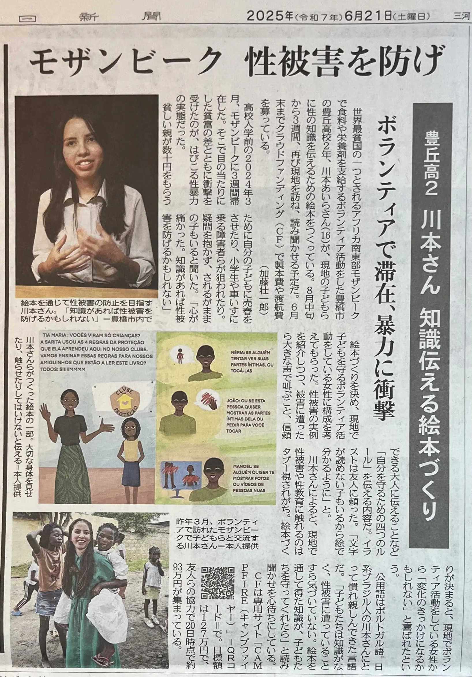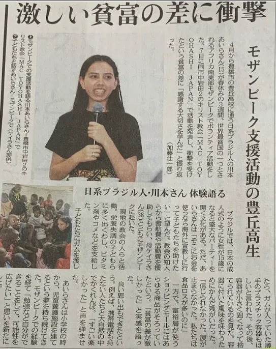 娘は、小さい時から人を思いやる優しい子でした。自分から人のためになにかしたいと考えるこどもでした。誰からも言われなくてもそれをすぐに行動に移せるこどもでした。お小遣いの買い物のお釣りも寄付箱にいれていました。ヘアドネーションも自分からしました。10歳から「親のいない子どもたちを助けたい」といっていました。私の故郷ブラジルでは15歳を盛大に祝う習慣があります。お祝いのために貯金もしていました。そして中学三年生15歳になりました。その時娘は「私のお祝いはしなくてもいいから世界をみてみたい、困った人を助けたい」と言いました。親としては現地で現実をみていやになるかもしれない。もっと助けたいと思うかそれはわかりませんでした。本人の希望に応えるためにお祝いは辞めてその貯金を旅費にしました。中学卒業後、24年3月にモザンビークで三週間のボランティア体験をしました。本人は現実をみてもいっそう助けたいと思う気持ちが大きくなりました。25年の夏休みも助けたい、モザンビークに行きたいと思いが強くなりました。しかし、自分たちだけの力では難しいと考えました。そこで教会のみなさんの助けもお借りして今回のクラウドファンデングを立ち上げさせていただくことになりました。
